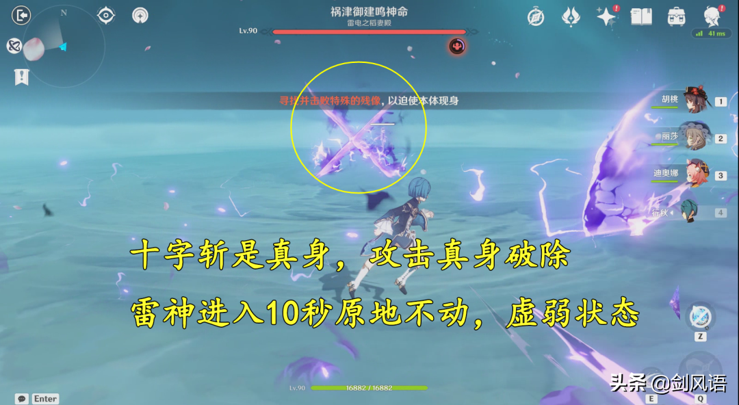 注意现场分身挥出剑光形状,十字斩形状的是雷神的真身,其他假雷神是一字斩。走近快速击破,打破雷神真身后,雷神进入虚弱状态,原地不动10秒,如前面一样,随便攻击。