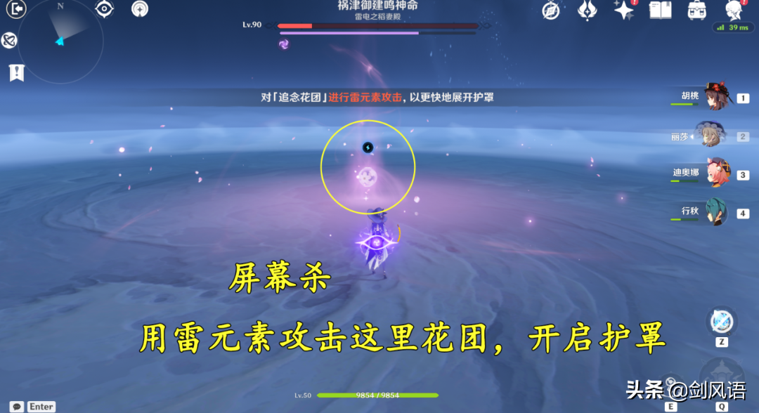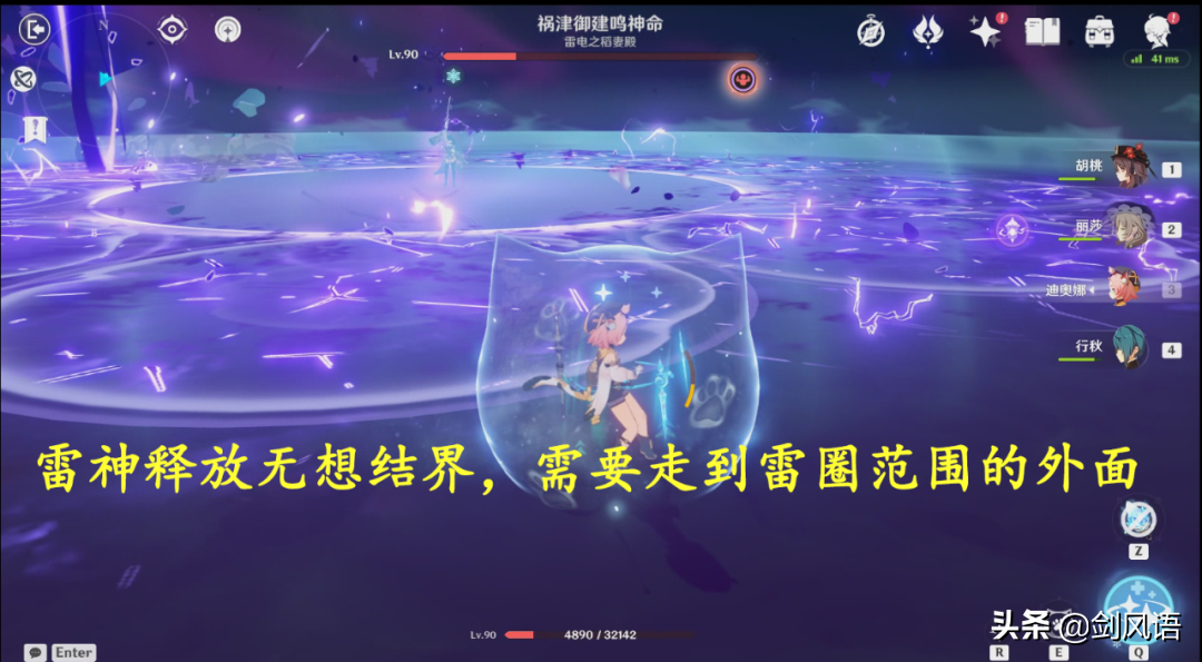 1.如下图,这是雷神的必杀技能,地上出现「追念花团」,需要在5秒内开启护罩。用雷元素攻击可以一次即可开启,用其他元素攻击需要三四次才能开启。提升效率和防止暴毙,建议带一个雷元素角色。