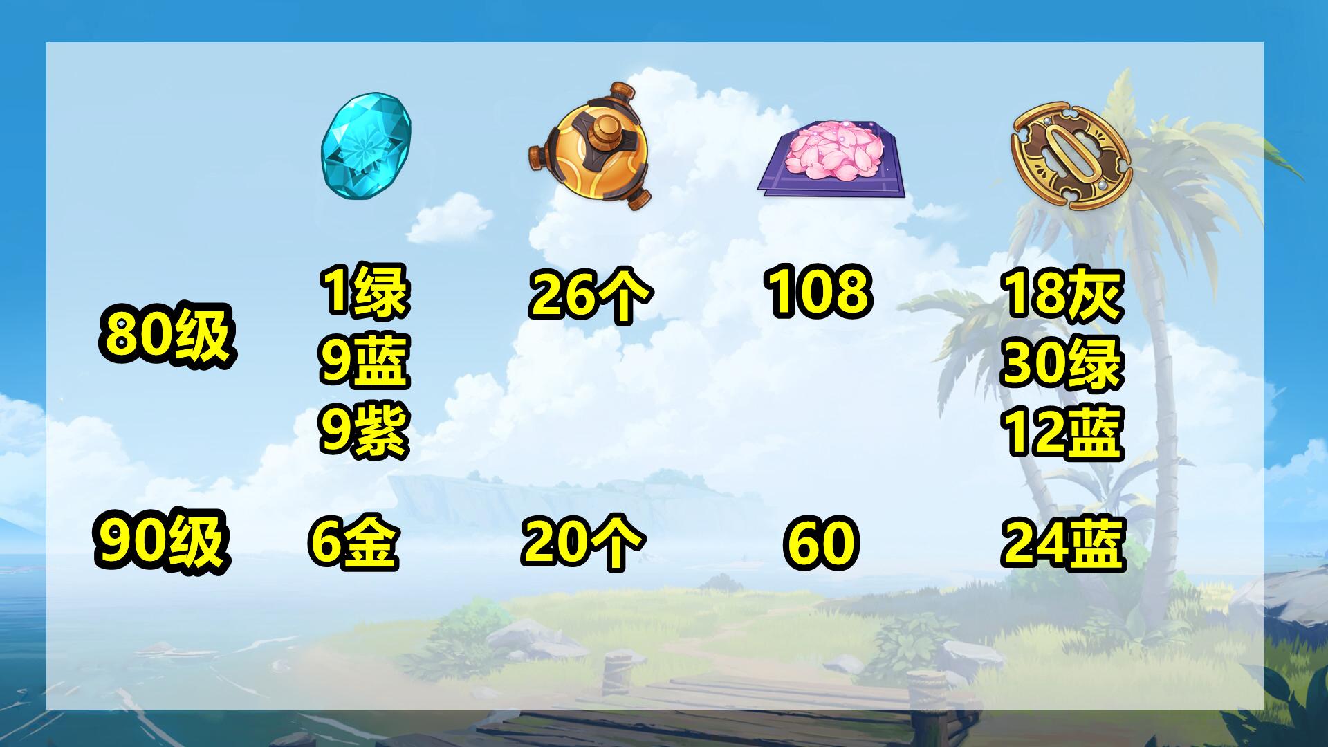 首先是绫华所需的培养素材,神里绫华升到90级总共需要冰玉(6金9紫9蓝1绿),机关之心(46个),刀镡(36蓝30绿18灰),绯樱绣球(168个)。