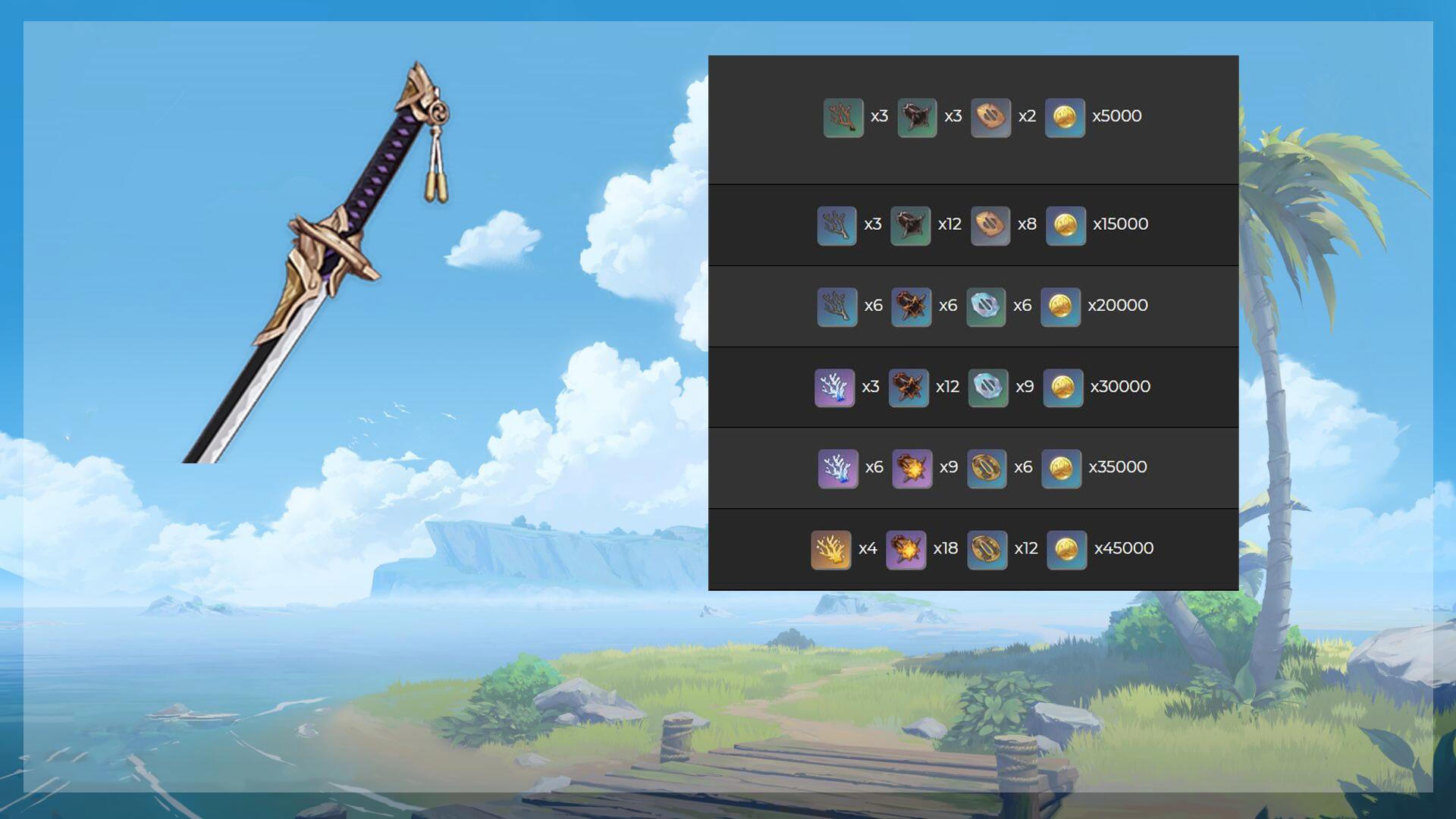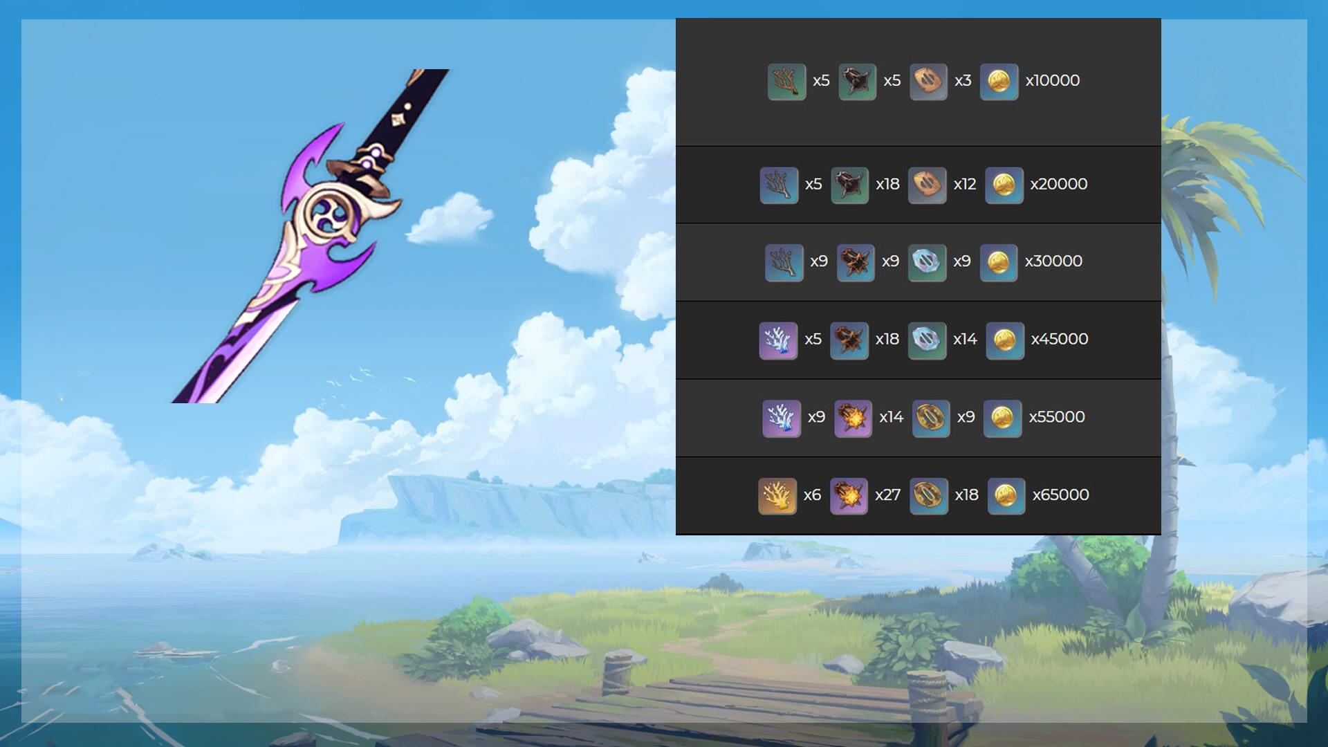 跟随神里绫华一同复刻的,还有5星单手剑【雾切】,【雾切】升到90级需要远海夷地的珊瑚枝(6金14紫14蓝5绿)、混沌机关(41紫27蓝23绿)、刀镡(27蓝23绿)。