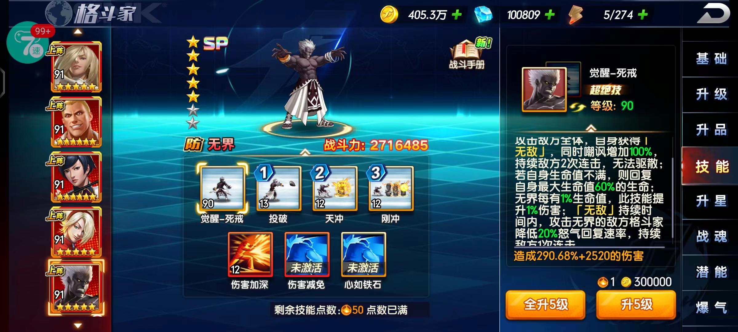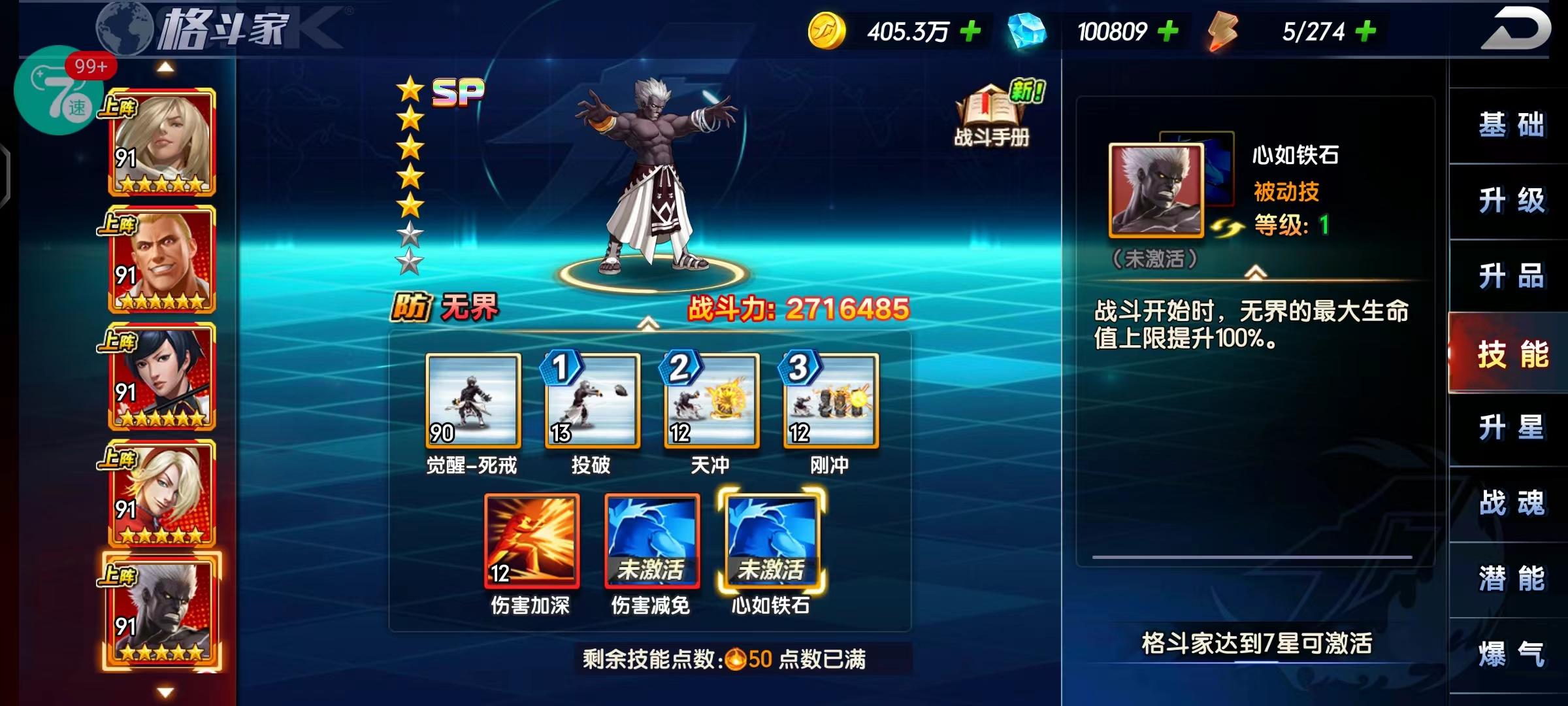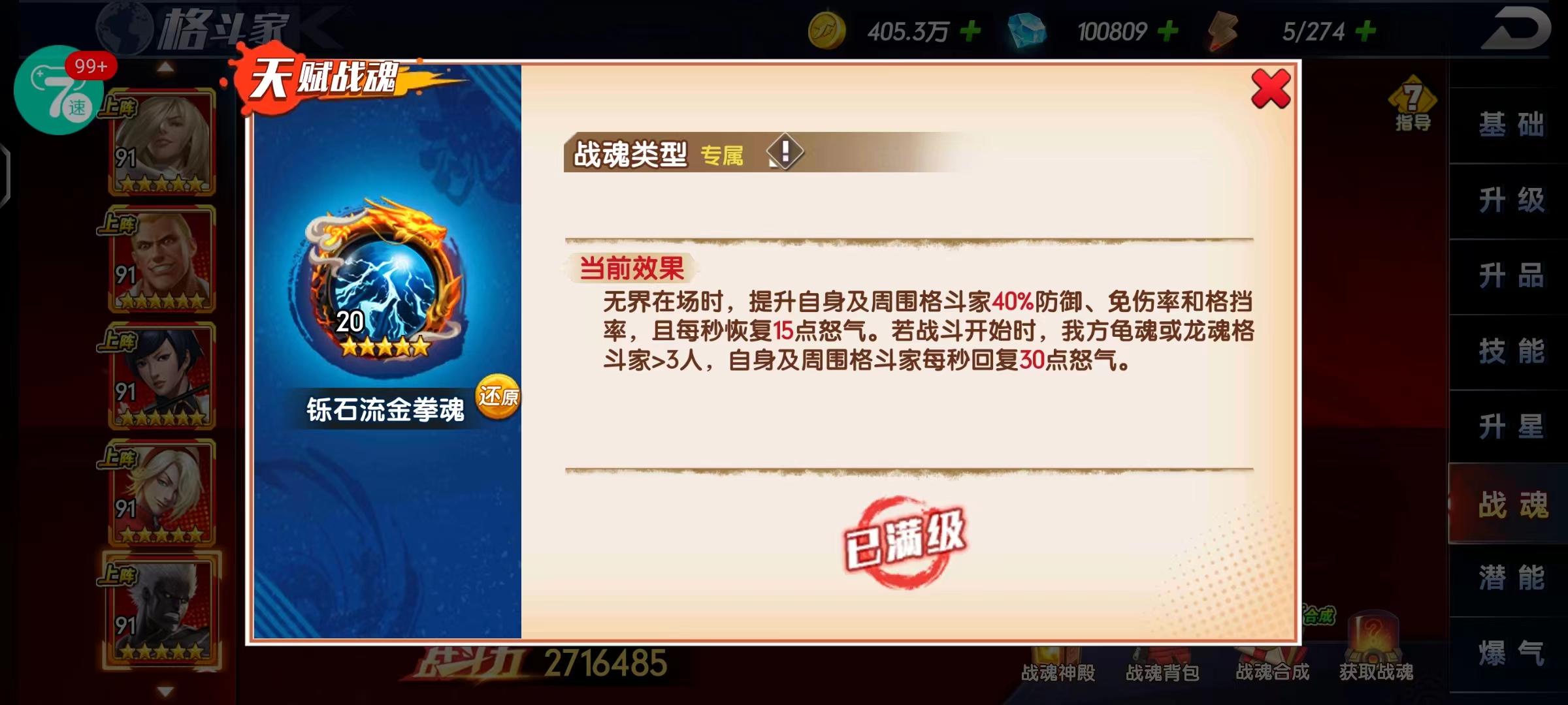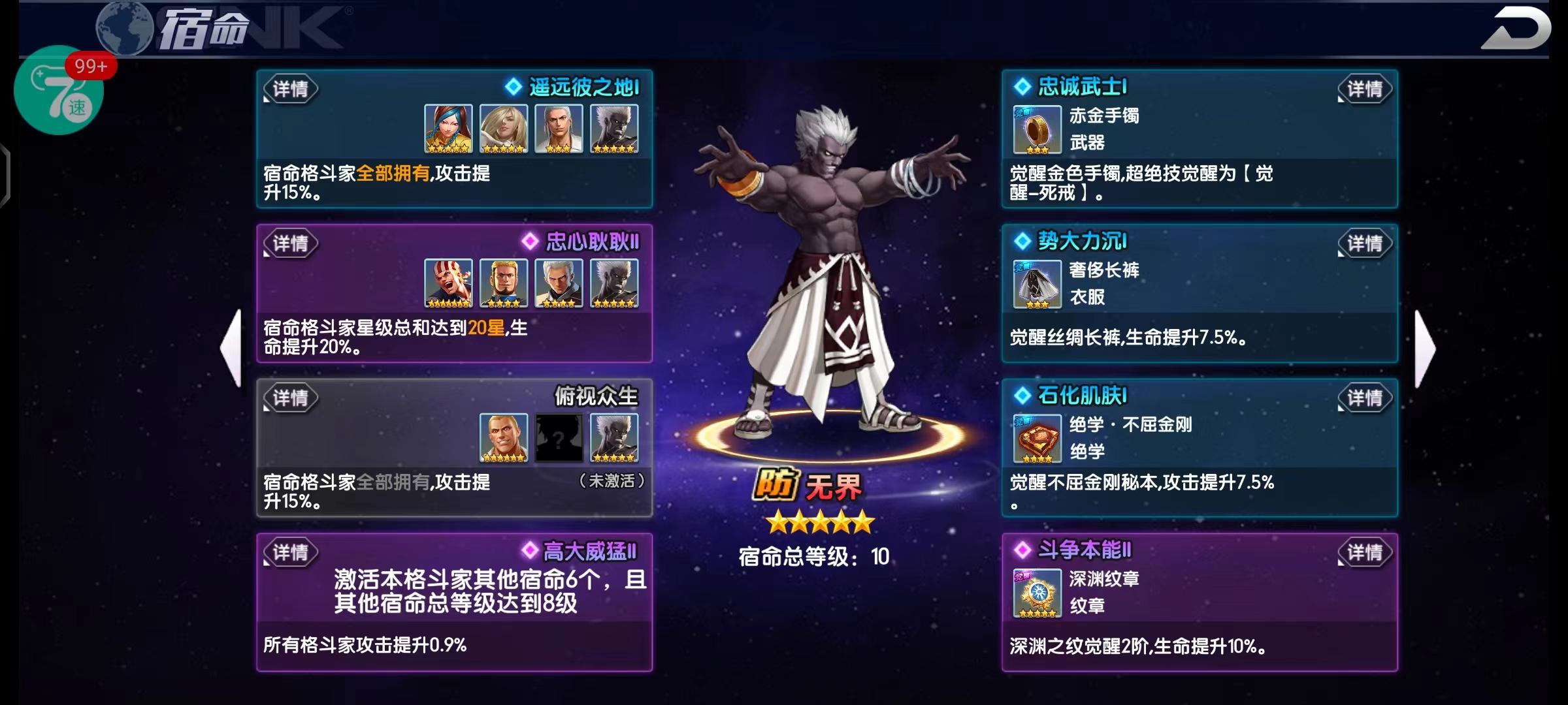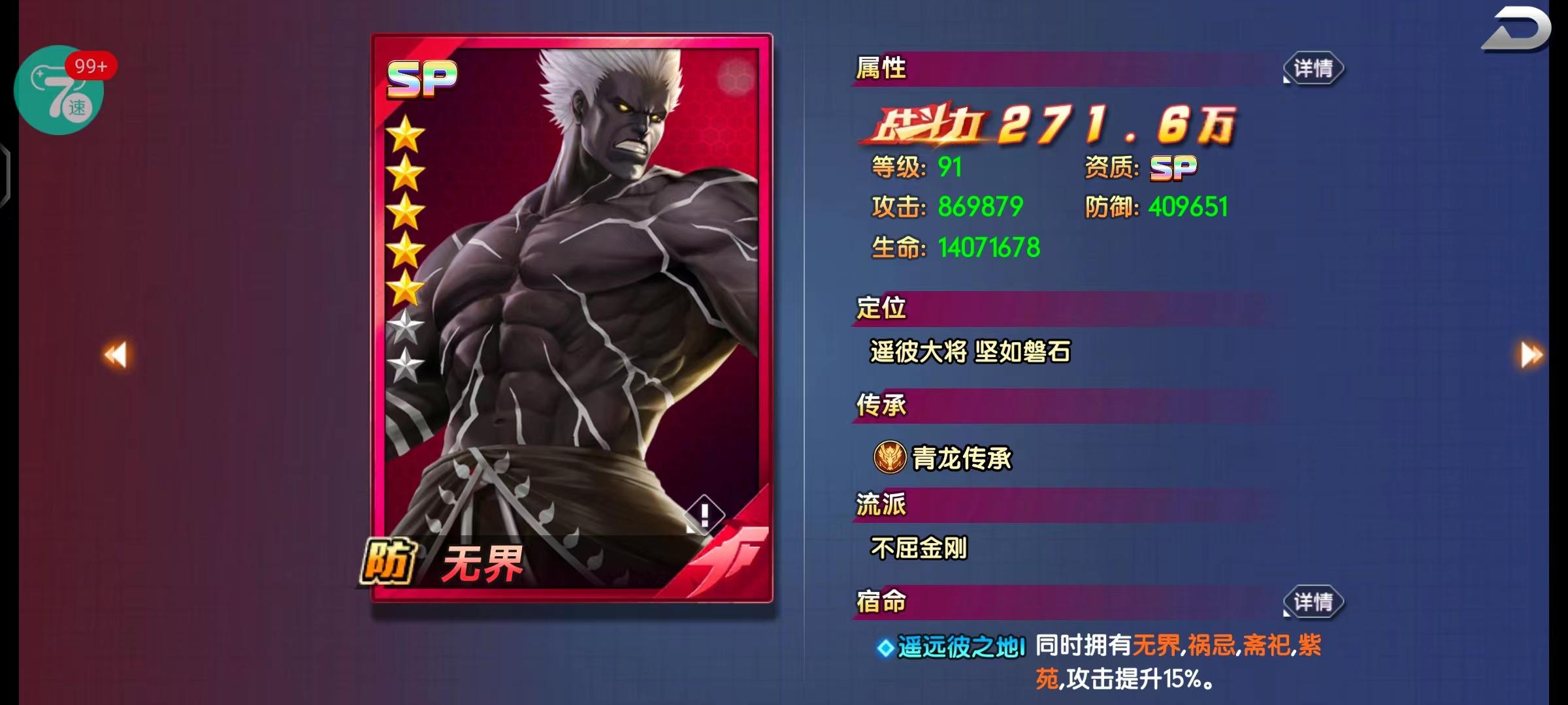 无界在场时,提升自身及周围格斗家40%防御、免伤和格挡率,且每秒回复15怒气。若龟龙战魂够4个,回复怒气翻倍。