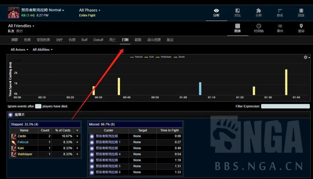 通过选择打断,可以看到整场战斗有谁进行了打断操作