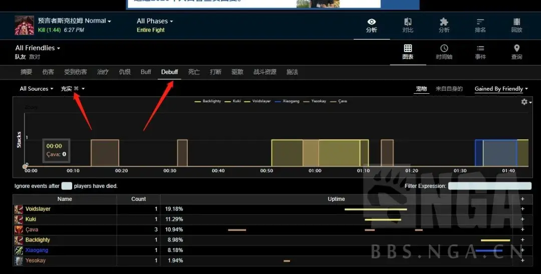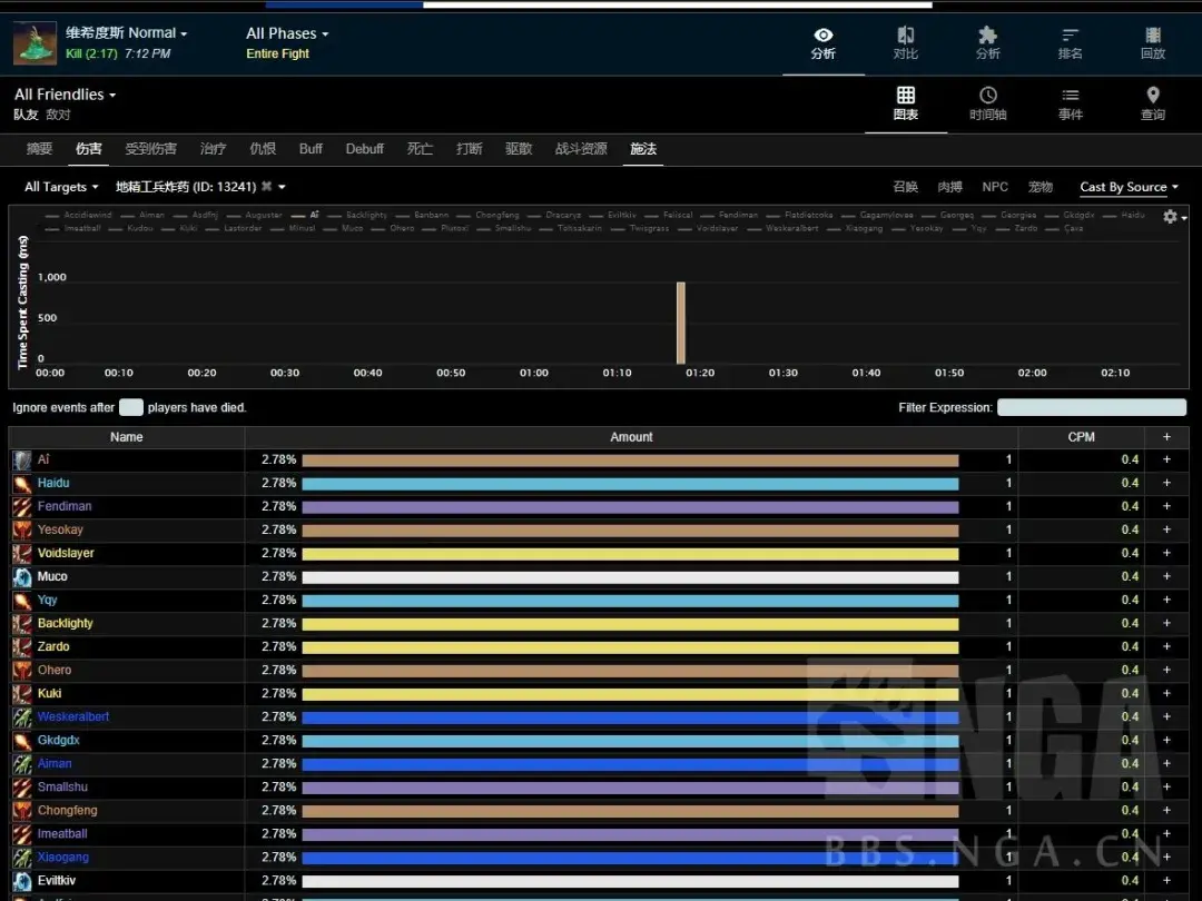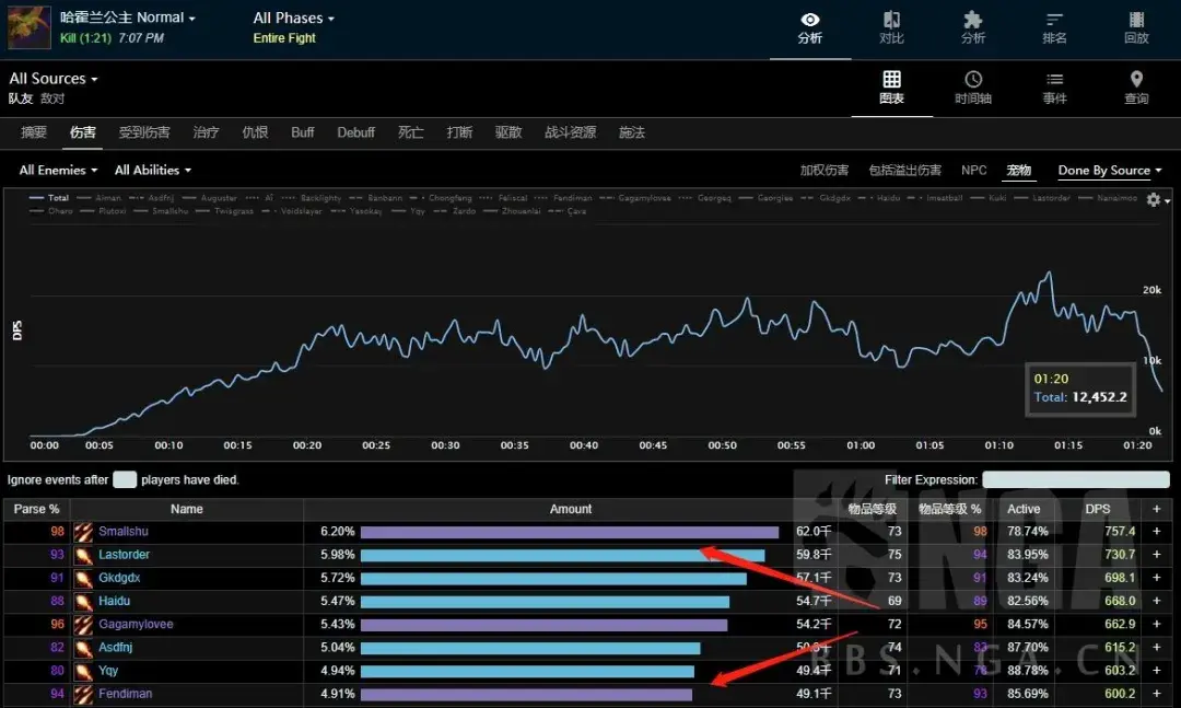 所以全程的dps,受到影响因素太多,要评判一个玩家有没有认真打,只看一个全程伤害,会有很多误差,最好还是细细来看。当然,dps低,一定是有原因的,如果团长仅仅因为一个团员dps低而批评他,不找出真正的原因,团员会有各种理由,我们需要做的,就是通过WCL,把无法找借口的理由找出来。包括但不局限于:能AOE的时候不AOE,该停手的时候不停手死,中各种boss技能,爆发忘记开,buff覆盖不全,等等。