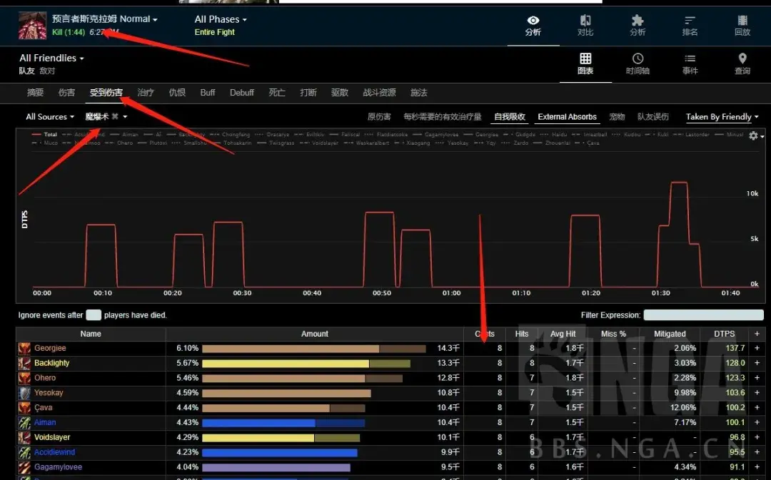 同时,通过选择受到伤害,技能选择奥爆术,我们可以看到,在本场战斗中,团队一共受到了几次奥爆伤害(漏掉了多少奥爆)-如图,在1分44秒的战斗中,团队共漏掉8个打断。这里也可以选择受到的大地震击的伤害,来看boss近战是否没有站人。