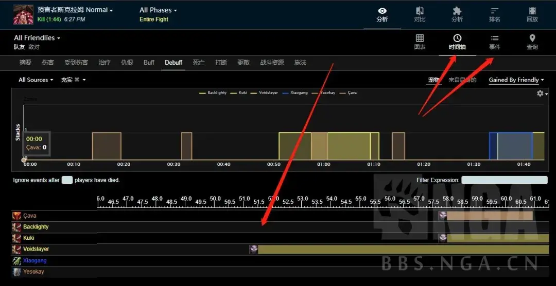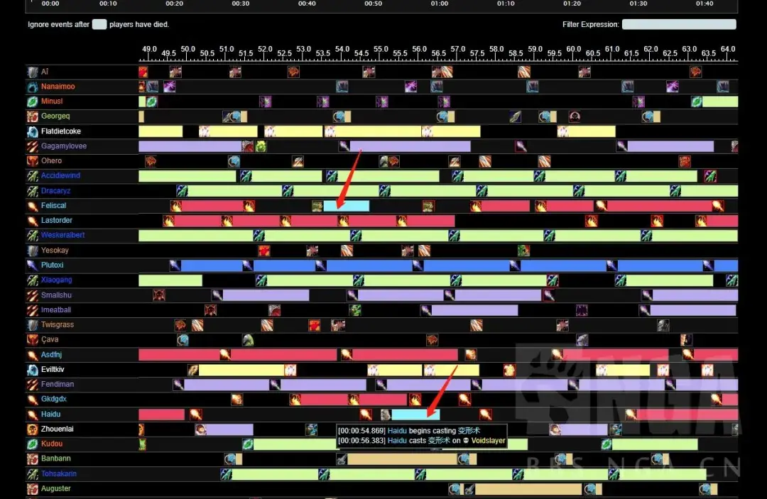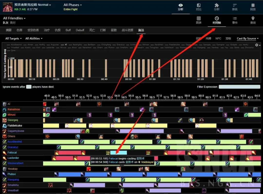 同时可以选择查看技能释放,和右上角的时间轴,我们可以看到V盗贼的心控,F法师和H法师断了读条在变羊。