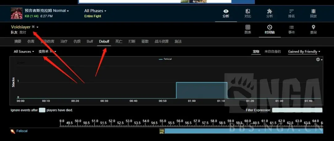 通过选择V盗贼的debuff中变羊术,可以看到F法师在55秒的时候,已经给V盗贼添加了变羊术。