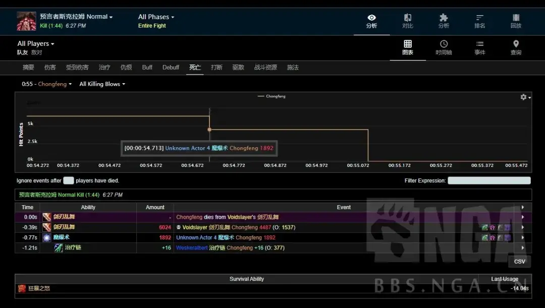 下图可以看到,55秒的时候,C战士由于盗贼的剑刃乱舞和魔爆术死亡。小彩蛋~有奶妈死于大地震击,这是坦克失误了。