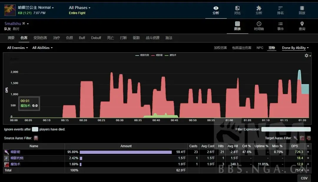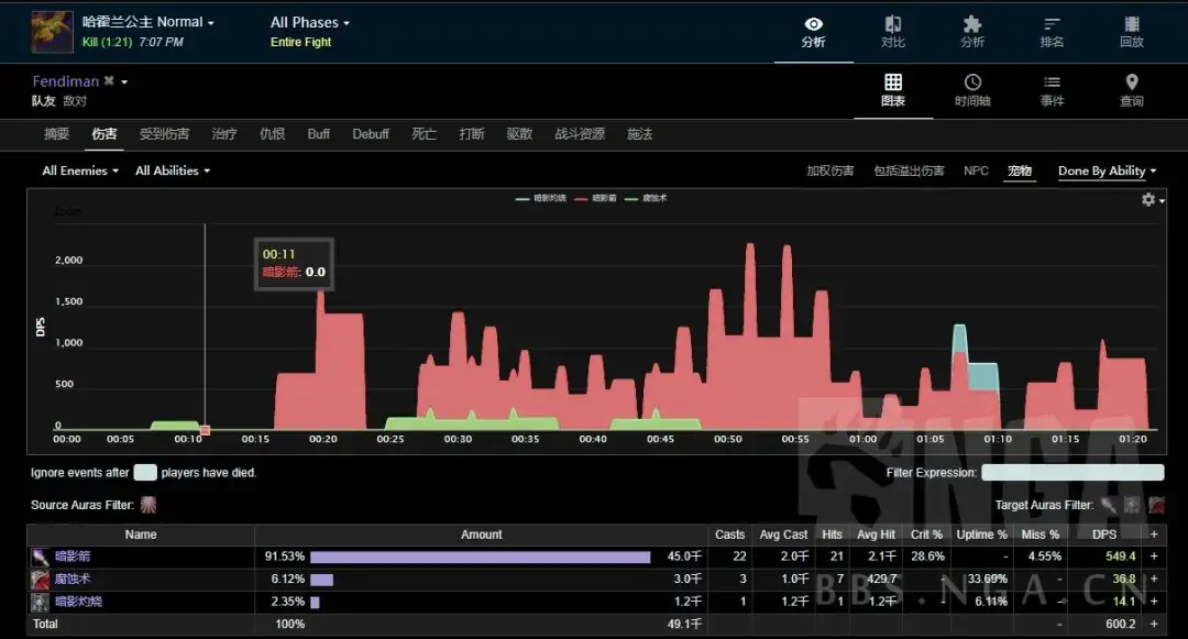 22个暗影箭和23个暗影箭,没有太大区别,都没有划水,区别仅仅是dps低的F术士,世界buff前面死了没了,暴击率少了20%,当然也有运气的原因,导致两位装备差不多都毕业,药剂吃全的术士dps在这个boss有差距。