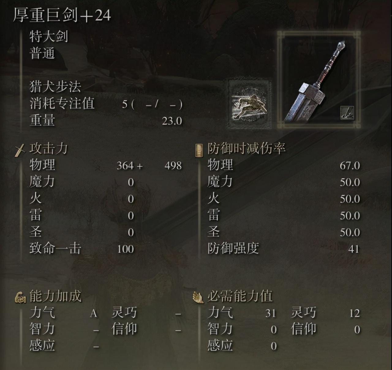 最后谈一谈遗迹大剑,这也是一把比较热门的大剑,我第一把强满的武器,但是实际效果真的差强人意,强满的面板也只比+24巨剑高一点,固定的战技动作削刃范围什么的都很不错,就是伤害实在是没法看。。。