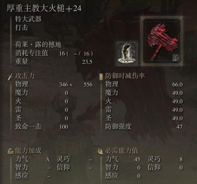 因为力量双持有1.5倍加成,所以前期能拿武器就行,多点一点血精,起码点到双30。然后补一补力量到40,之后可以考虑把信仰点到25(主要是为了黄金树誓约,如果用战技可以少点一点;
