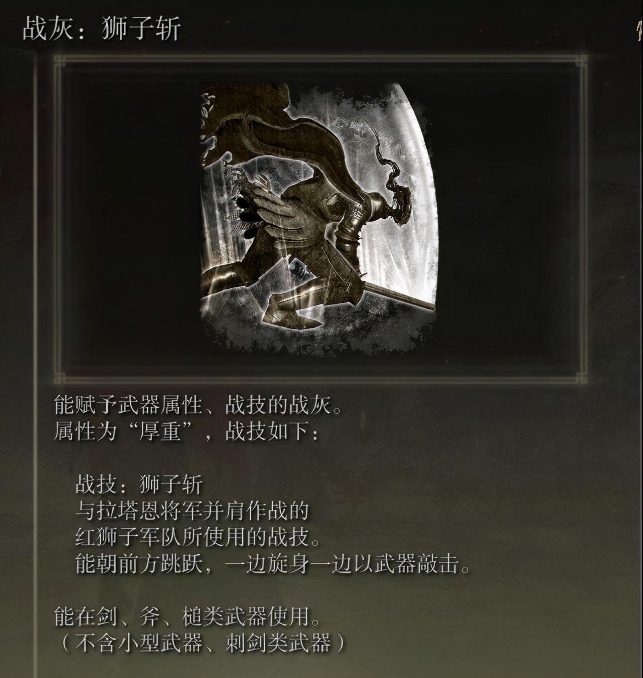 2、狮子斩,我认为的近战物理最强战技,极高的削刃,极强的霸体,不错的伤害(无buff决心跳劈差不多的伤害)。同时能够快速积累boss的架势槽打出处决,黑剑吃两发就能进处决,四次狮子斩能直接带走黑剑。