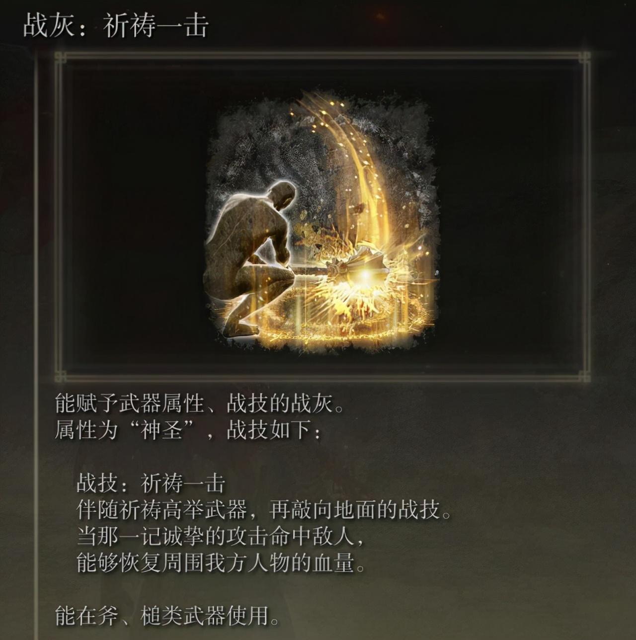 3、祈祷一击,锤子专属战技,这个战技的削刃和狮子斩差不多,都能把人形怪砸趴,伤害稍微低一点,而且有一定的前摇所以打多动症容易空。但是,但是,它能回血!