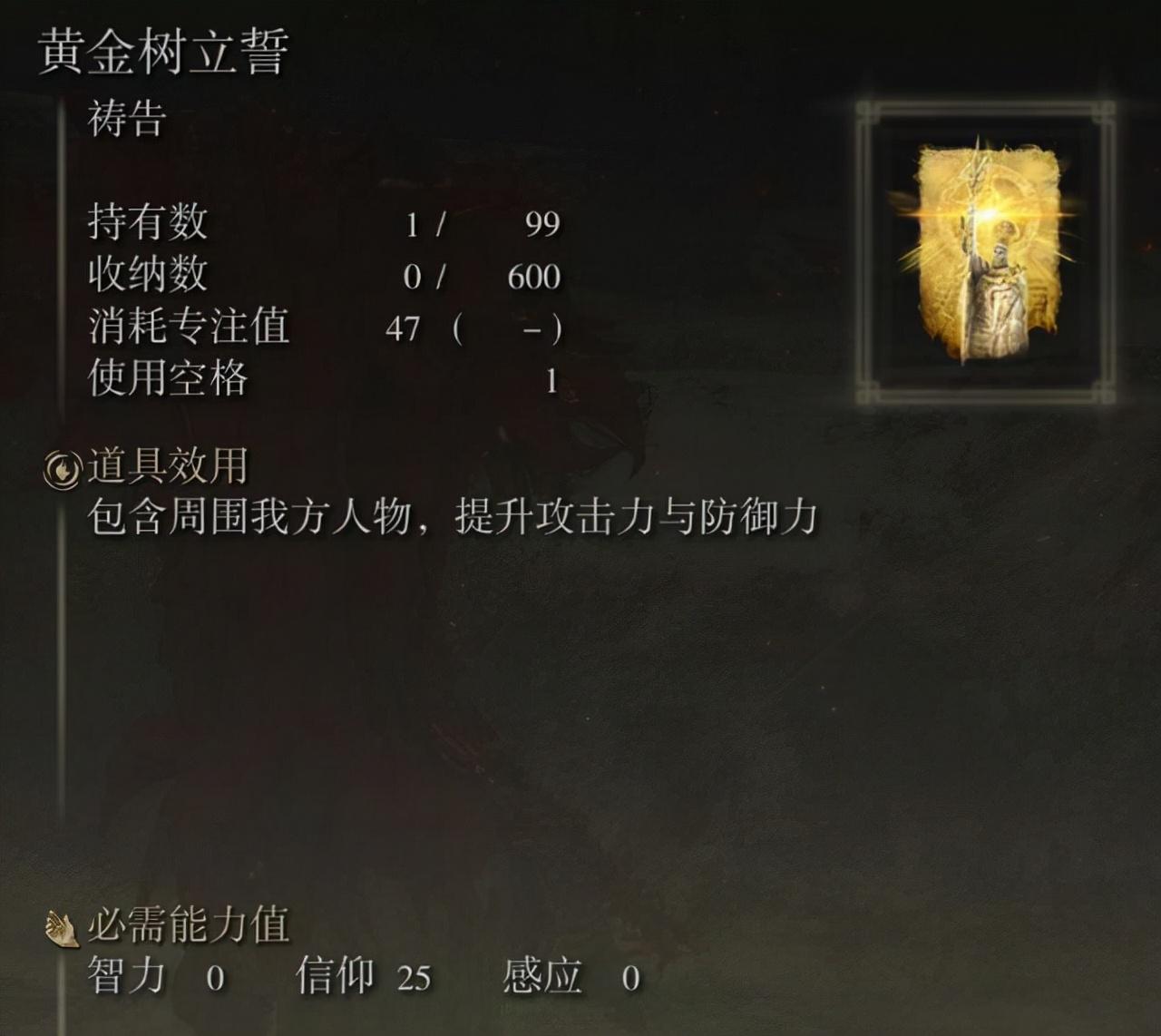 1、黄金树立誓,法环版金石之誓。攻防增加15%,无论是打boss还是打精英前都可以上一下。这个技能有战技版本,如果信仰不够可以先用战灰凑合,我是懒得切武器所以把信仰点了一些。