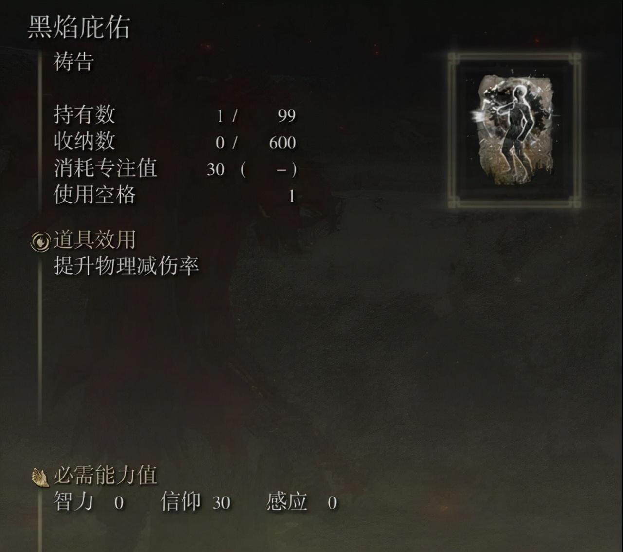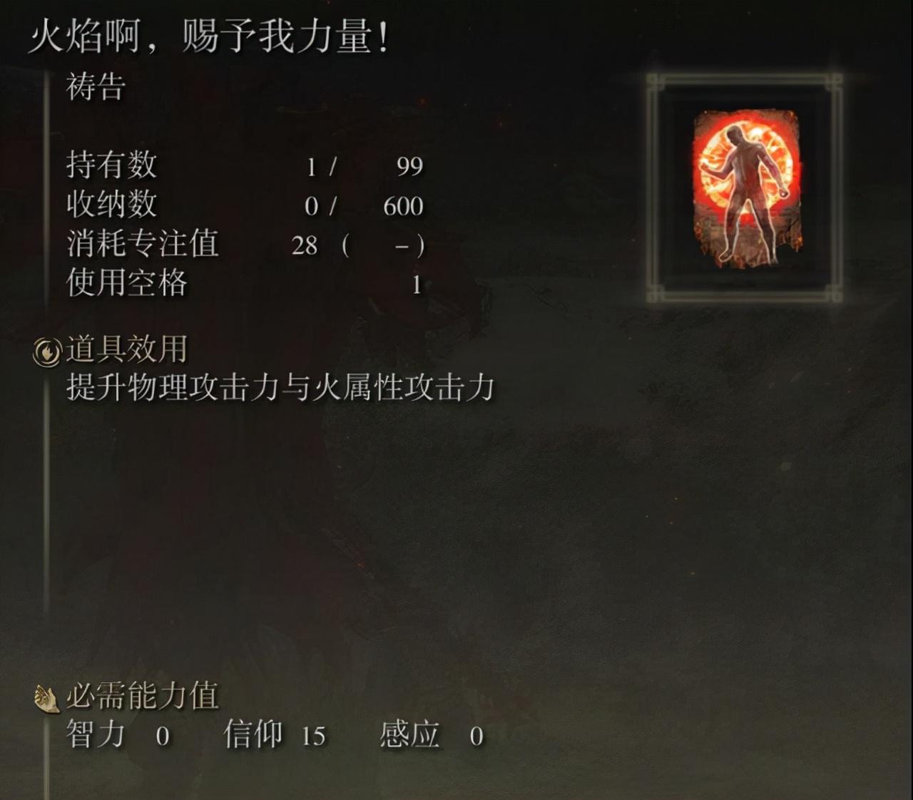 2、火焰啊,赐予我力量。法环版内在潜力,30%的攻击加成,持续时间比较短只有30s,强化我们开局的爆发能力,某些比较脆的怪能直接莽死。雪山那只死亡仪式鸟,我上了这两个buff之后打头一锤子7k多,三锤子搞定了。