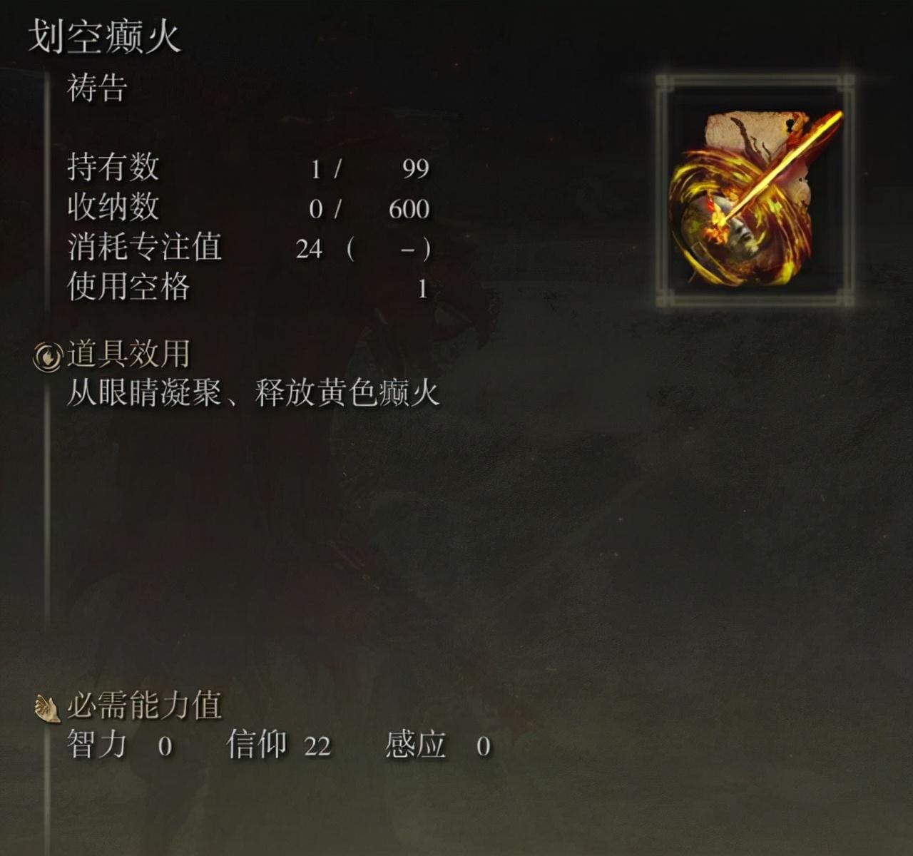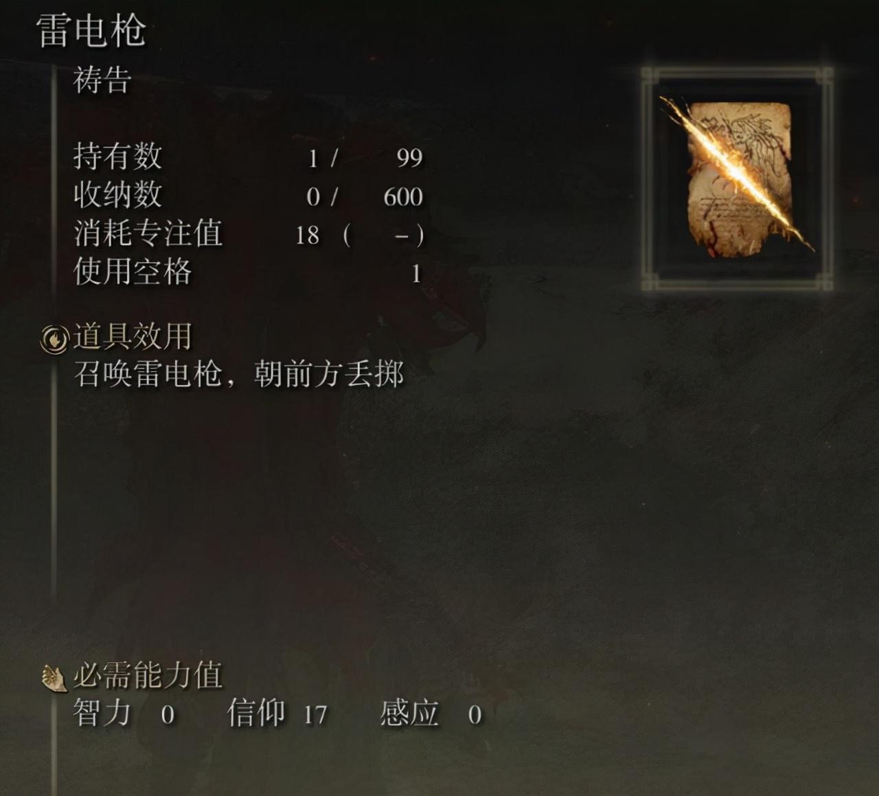 4、剩下就是一些远程输出类祷告,用来处理一些近战摸不到又很烦的远程怪。我推荐带两个就行了,一个雷枪,出手快。一个滑空癫火,射程远。平时用的不多只是以防万一。