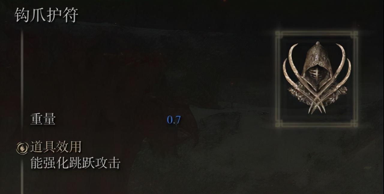 2、钩爪护符,史东薇尔获取,强化跳劈,跳劈必带没什么好说的,碎星剑推图的时候最好常驻。