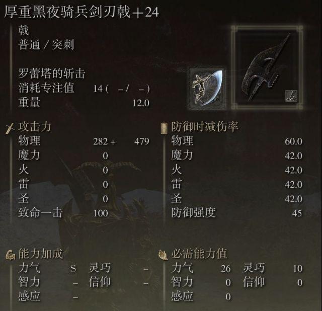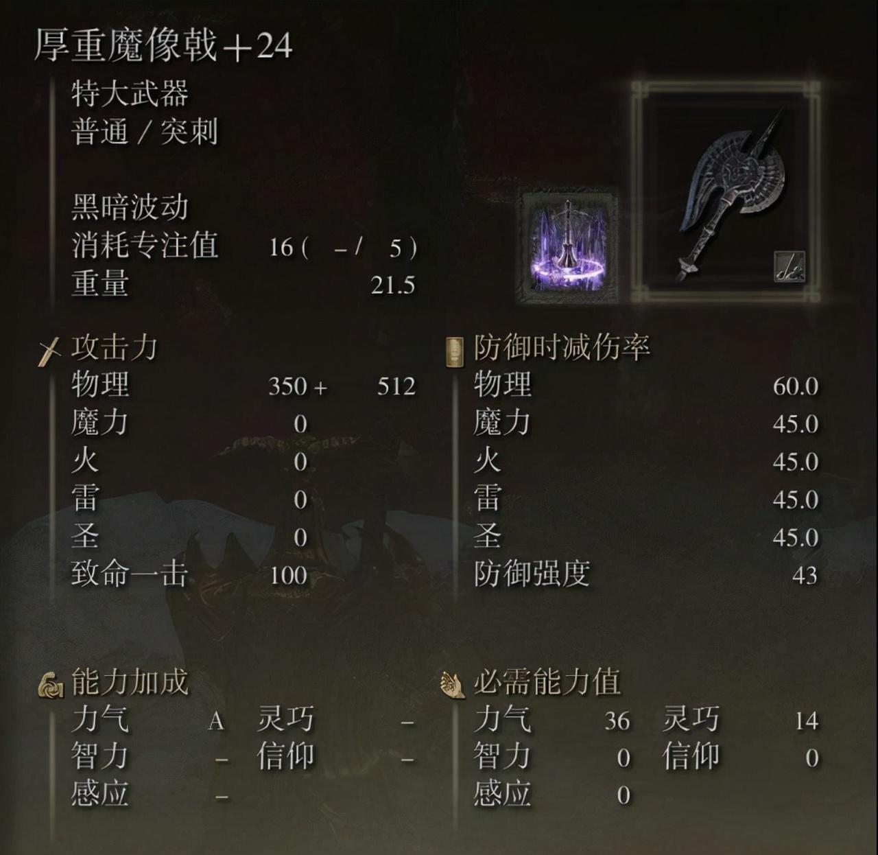 虽然是戟但是分类是特大武器,就是和大锤大斧一类,原本战技是枪类的突刺,但是要变质所以换掉了。优点是长,非常长,比任何大锤大斧都长一截,面板和巨剑差不多。