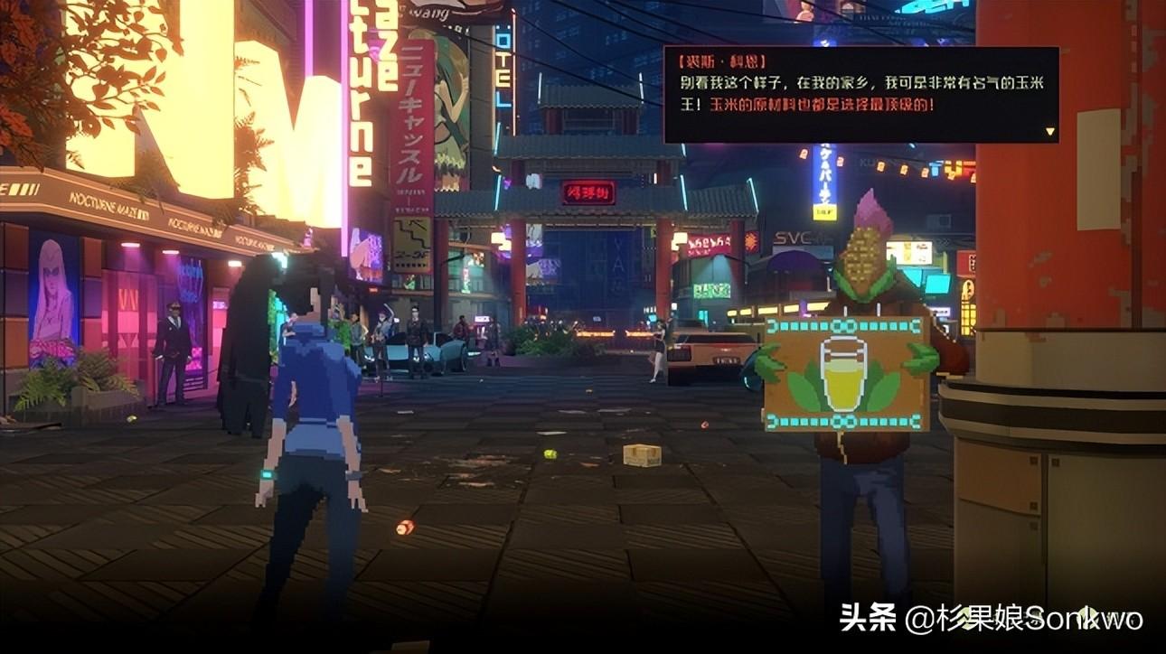 跟随任务的引导,当我走出公寓大楼时,这款游戏首次亮出了它的野心。鳞次栉比的大厦间搭载着各式各样外观新奇的广告牌,与高饱和的信息内容相对的是公寓走廊以及大街上出现的茫茫人海,而这一切通过像素的渲染呈现出了别样的滋味。