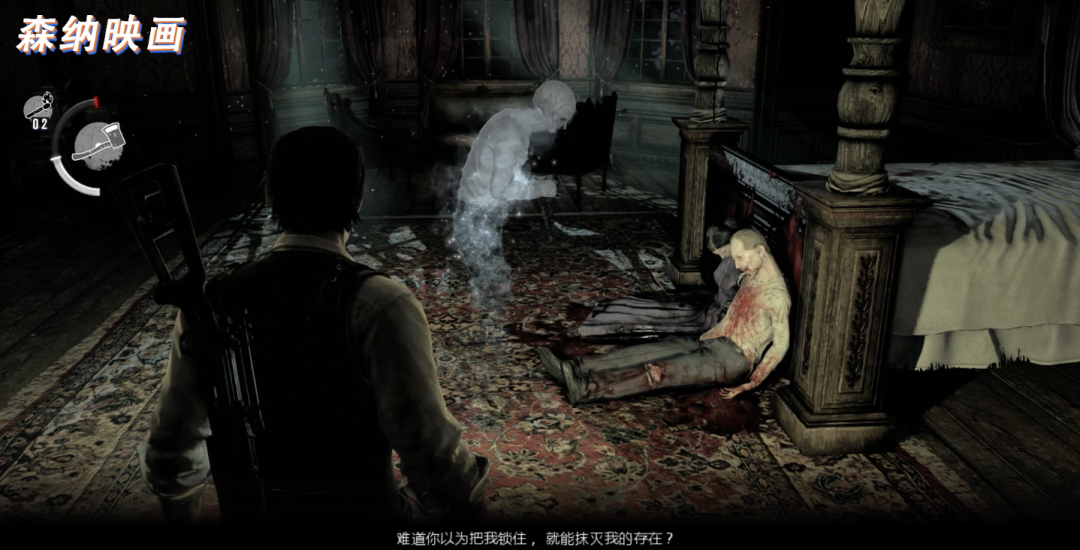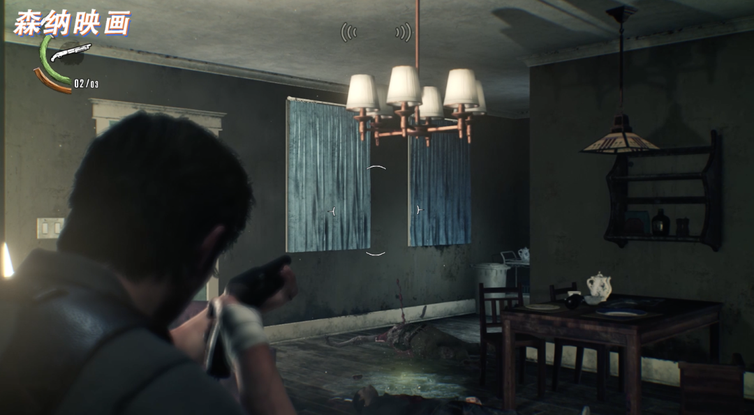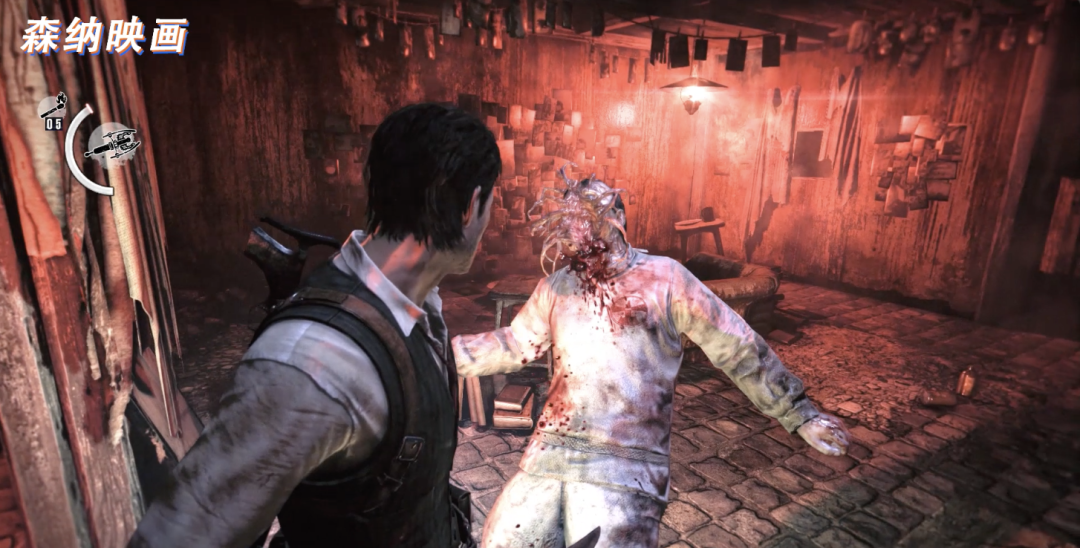当我们再次醒来时,已经如一头过年待宰的猪一样被倒挂了起来。《恶灵附身》系列无论是1代还是2代,两作的第一关都是给玩家一个下马威。第一关的气氛都相对诡异和恐怖,同时需要在手无寸铁的情况下逃离一个追杀者。