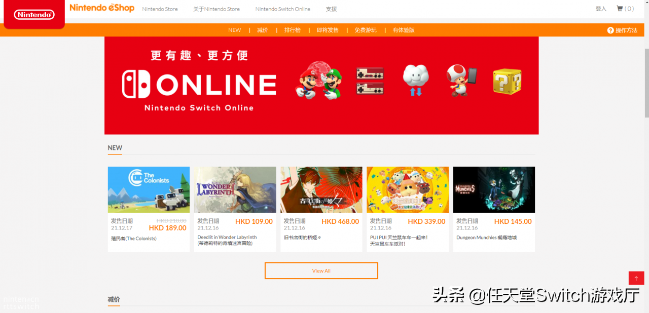 香港任天堂又有新动作了,最近港服eShop的网页版宣布正式上线,可以看到网页版eshop页面比较简单,分成了NEW、减价、排行榜、即将发售、免费游玩、有体验版等多个栏目,每个栏目默认指显示5个游戏,更多的需要点查看全部。