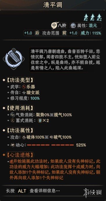 输出选择旋女弹琴平A,魔音的特殊机制决定了魔音平A是dps最高的平A,别的武器还在打破绽时魔音已经能打出稳定伤害了,清平调作为8品技能命中比7品高出一大截。