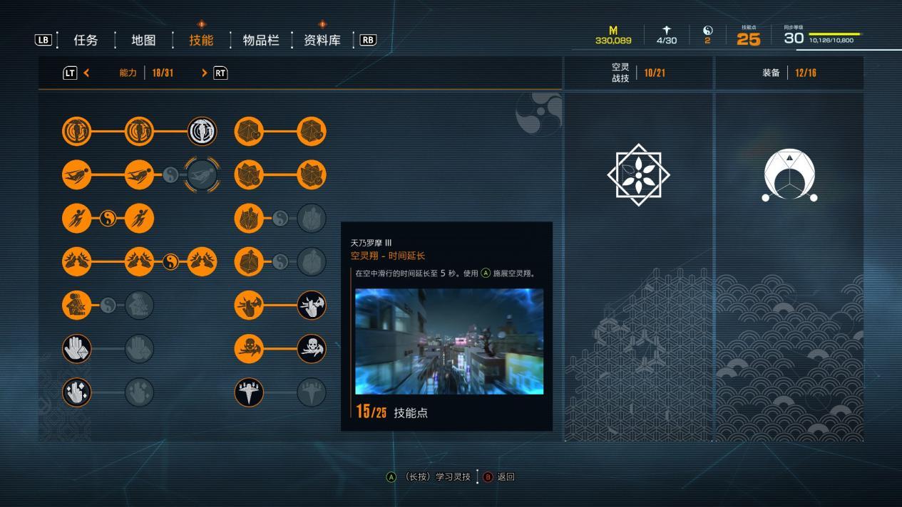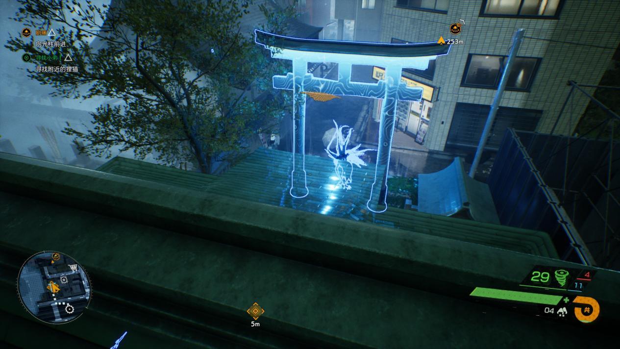 类似的还有各种猫又商人——《幽灵线:东京》整体的地图范围并不大,加上各种传送跑图还是十分便利的,按X开启灵视还会有通往任务或者目标地点的直接提示。不过还是推荐第一时间点出“天狗跳”的进阶技能(需要7个勾玉和45技能点)——这样就可以在空中特定位置召唤天狗,大大提升了跑图的便利性(进一步的提升推荐点出空中滑翔距离)。