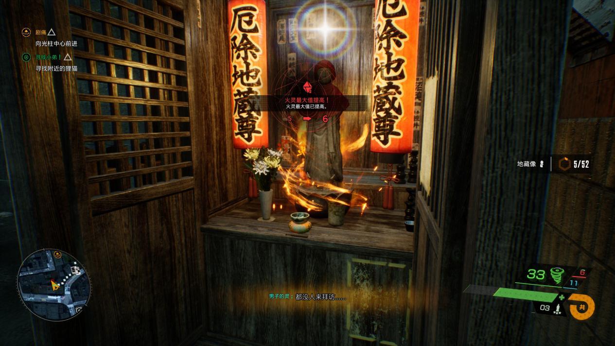 值得一提的是部分鸟居会有供奉箱——供奉500可以开启地藏菩萨或者研究文件的位置(还有一些比如最好吃的拉面、一切结束了干嘛、想要忍者出现在身后等意义不明),供奉100则可以回复血量或者蓝量,游戏内的金钱十分的宽裕所以可以毫无压力的供奉,尤其是收集地藏是事实上除了升级以外提升战力最有效的途径,推荐尽可能优先完成。