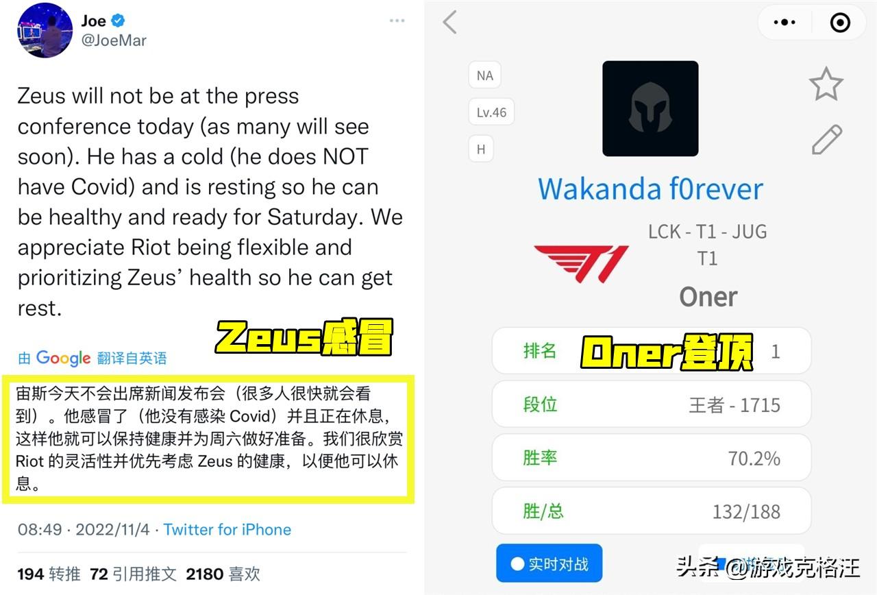 11月6号早上8点,S12决赛T1对阵DRX,在此之前T1有一好一坏两个消息。坏消息是上单Zeus感冒生病了(不是新冠),他正在好好休息,因此缺席决赛新闻发布会。好消息是打野Oner以1715分70%的胜率登顶美服,188场Rank赢了132场,可以说是通天代了。Oner的成长大家有目共睹,Zeus是T1史上最强上单之一,希望能以一个好的状态去角逐冠军。