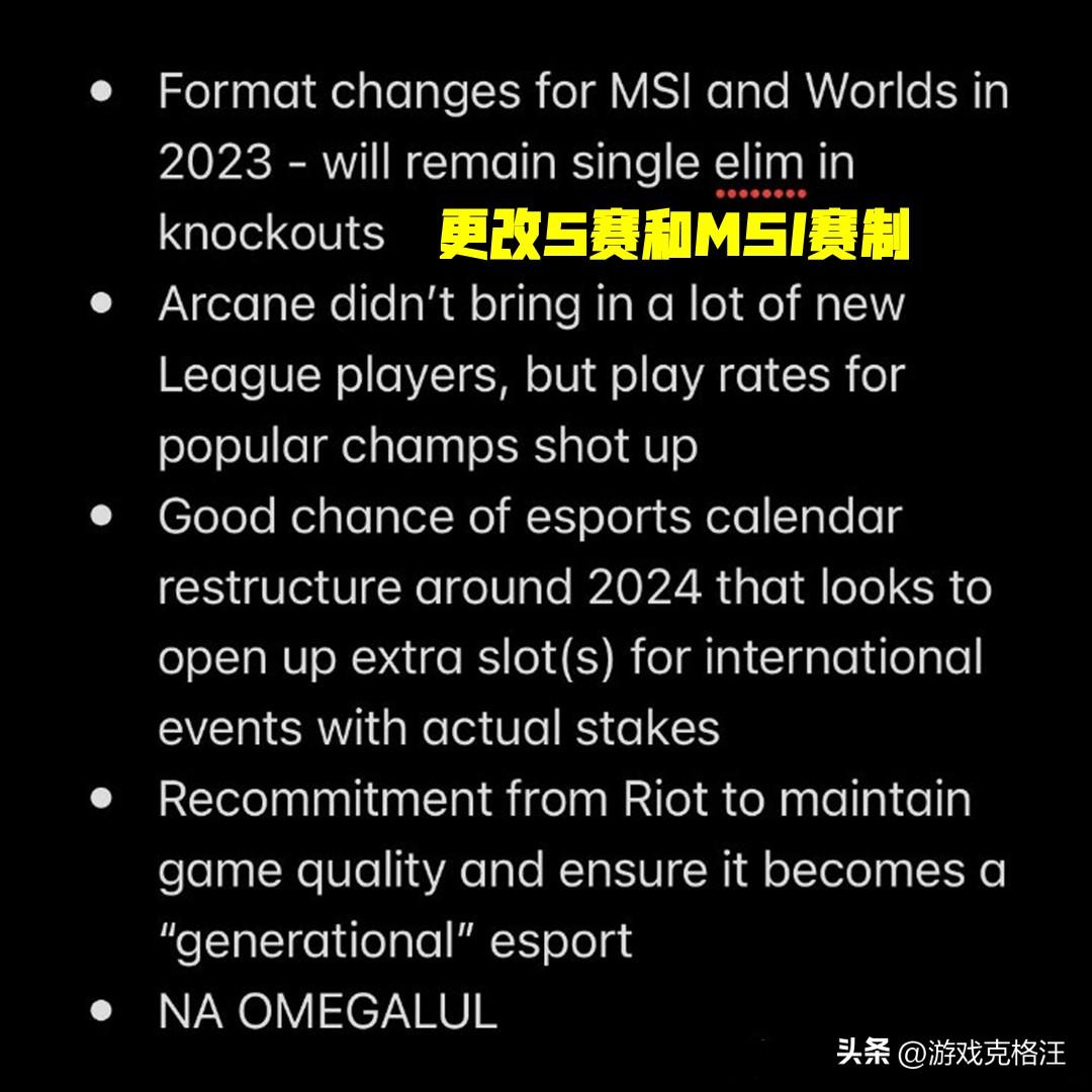 众所周知,目前英雄联盟有三大国际赛事,MSI季中赛、全球总决赛以及全明星赛。最熟悉的S赛,老观众看了近10年,先进行小组赛BO1,再进行淘汰赛BO5,多多少少都会有点麻木。S12决赛开打前,拳头负责人表示2023年MSI和S赛都将改制,但淘汰赛依旧会采用单败淘汰赛制,并计划在2024年推出新的赛事。