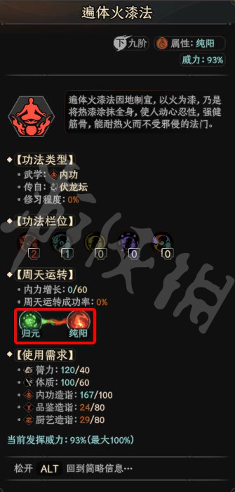 而下方的图例则表示进行【周天运转】时的内力属性转换,如下图【遍体火漆法】就是将归元转换成纯阳。