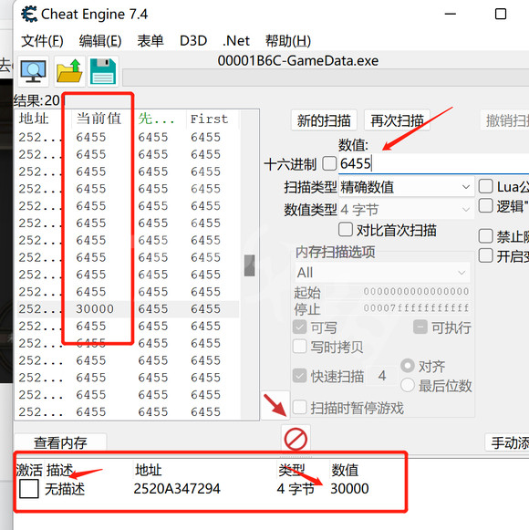 有一样的数据就是他了,双击他就到下面了,点击左边激活锁定,右边改成3万。大家就能愉快游戏,不怕历练突破问题了。