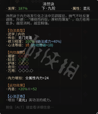 沛然决被很多玩家公认为是新手能够拿到的最好武学,注意是新手的最好武学,相当于四品的内功。