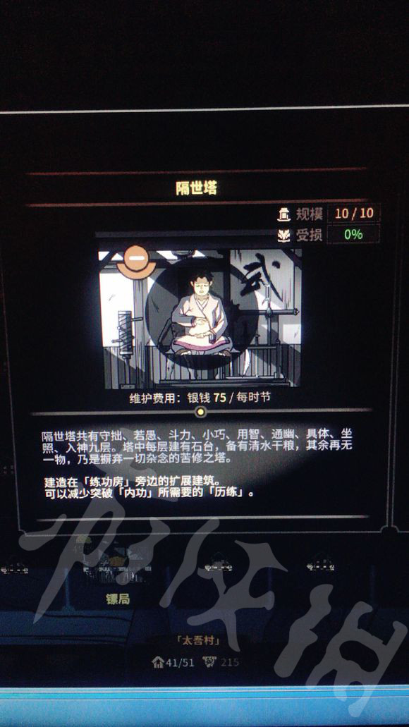 上图的解释是减少内功突破所需要的历练,注意是突破,并不包括修习,那么让我们来看看具体的效果如何。这里造了一个10级的隔世塔来测试效果,这个建筑成本不大,10级还是很容易升上来的。