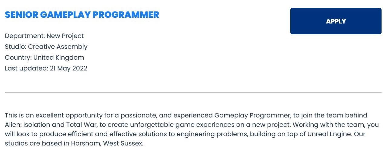 据世嘉和Creative Assembly发布的招聘信息显示,该作是一款全新产品,CA也是第一次使用虚幻5引擎,不过该作具体信息没有描述。早先CA曾宣布《异形:隔离》主要团队成员正开发一款全新IP,新作确认为科幻FPS类型。目前不清楚CA的虚幻5新作是否就是之前那款FPS。