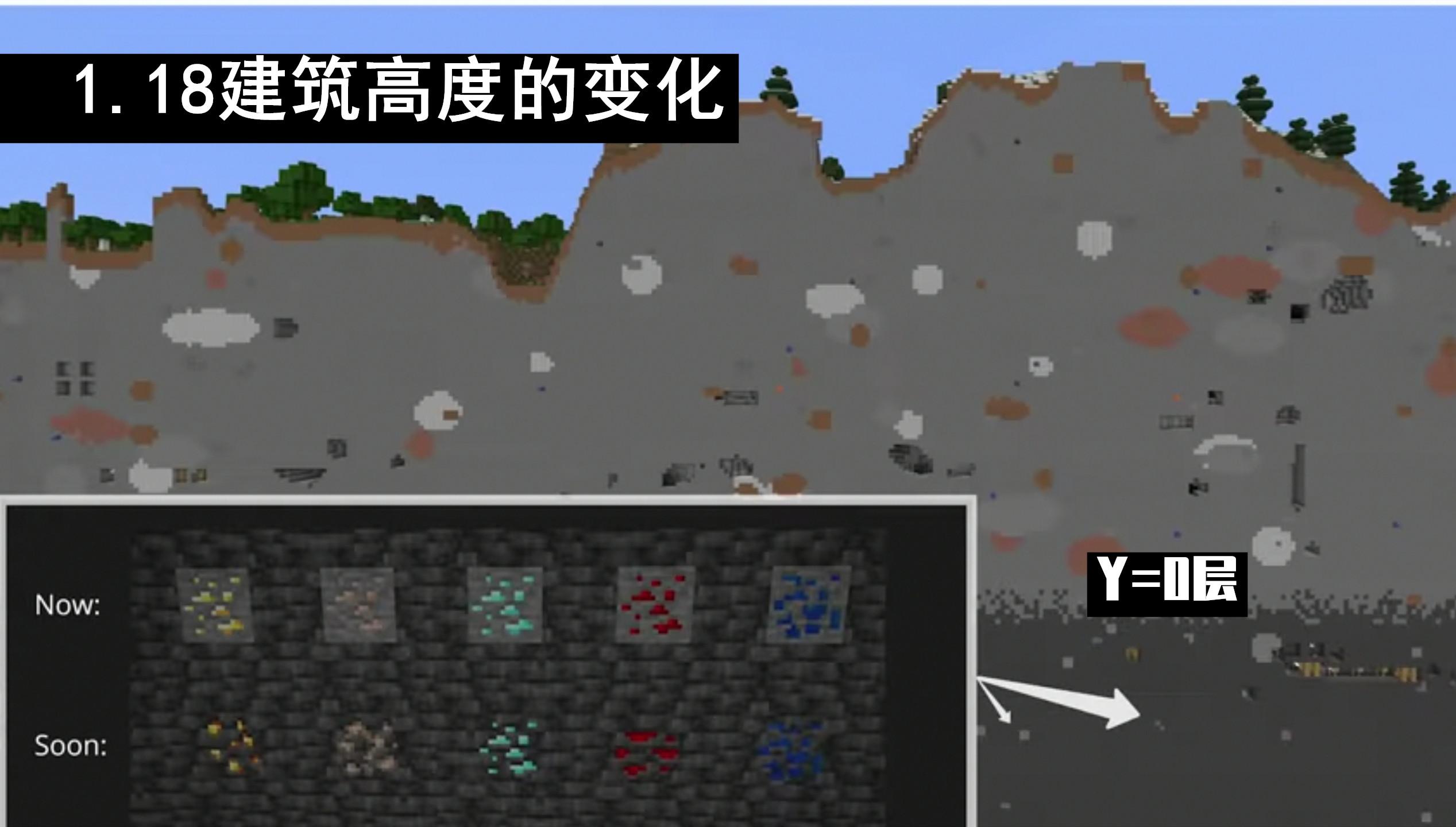 所有矿石生成的高度被重新分配,以前的挖矿逻辑或许不再适用新的版本。物品诸如潜声传感器、收纳袋的回归;