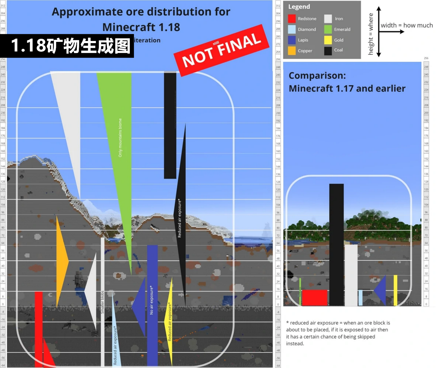 在1.17最初的快照更新中,虽然建筑高度扩增到了320格内,山地虽然也全方位地做了地形重写,但生成类型并未做详细划分,到了1.18全新的山地地形将会分为五种: