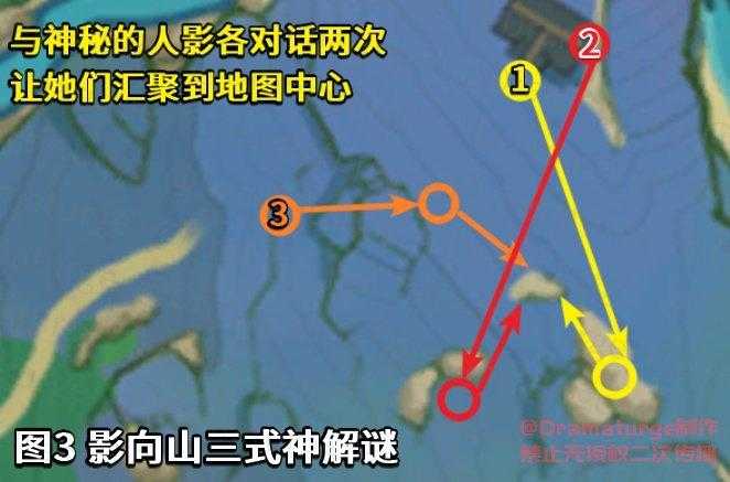 解谜攻略:与三个谜样的人影各对话两次,让她们汇聚在狐狸雕像处。(见图3)