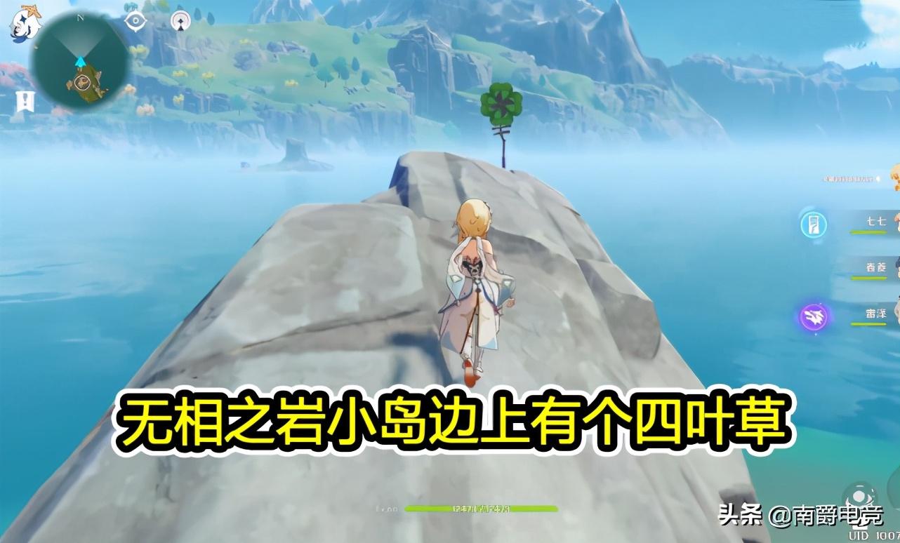 第一种是瑶光滩右侧有一个传送点,到这里之后就可以慢慢游过去,或者是用冰系技能慢慢冻河面走过去,这种方式比较慢,还有第二种更简单一些的方式,来到无相之岩的挑战地点,也就是孤云阁传送点右边的那个岛上,在无相之岩的悬崖地带,有一个绿色的四叶草,这个四叶草很偏僻,在突出的一块岩石最边上,走近了才能看清。