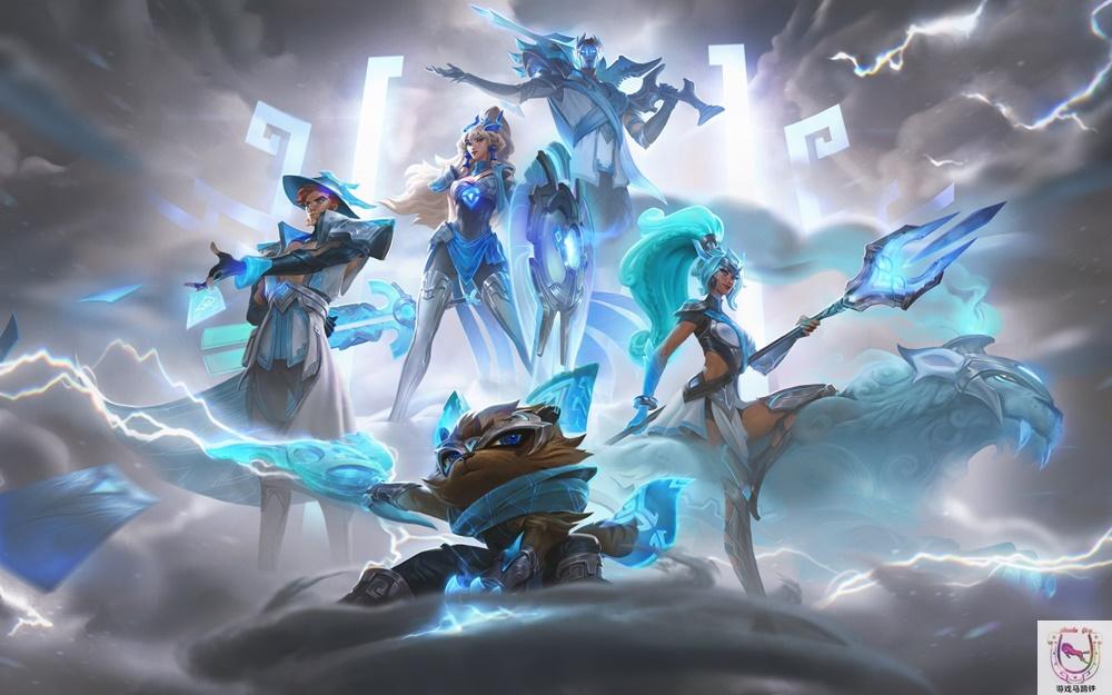 冠军皮肤阵容:凯南,豹女,卡牌,烬,蕾欧娜。主色以DWG的队标蓝色为主,武器赋予了碧玉质感,另外也算是取消了过去比较固化的耳机设定,采用了更加高科技的头饰。