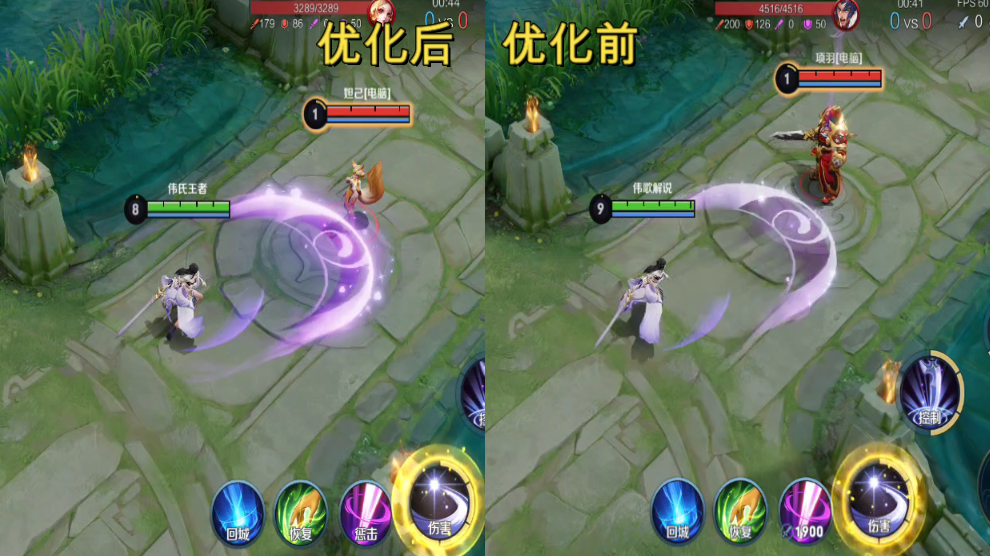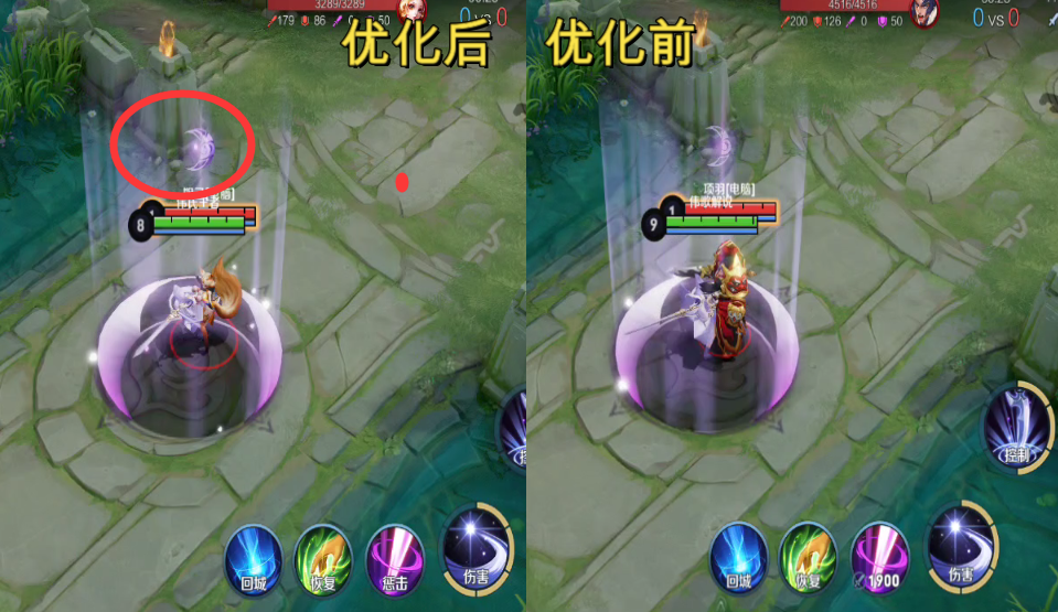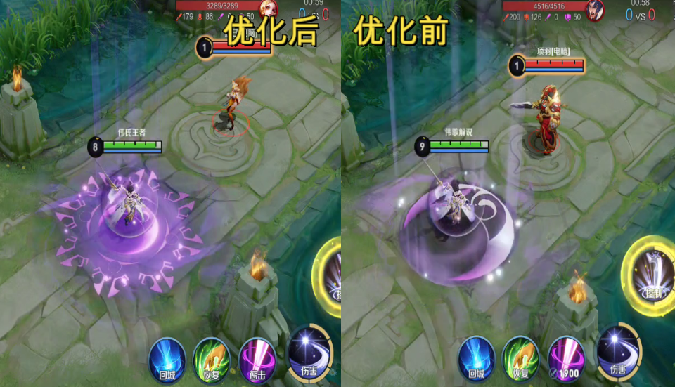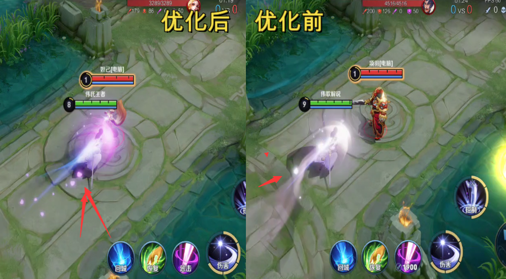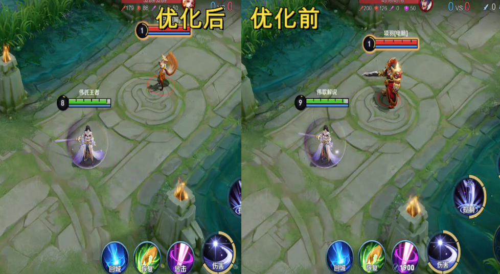 首先来看看普攻特效优化前后的对比,差距看起来不是很大,不过敌方英雄头上标记的月牙印倒是优化的更亮一些。