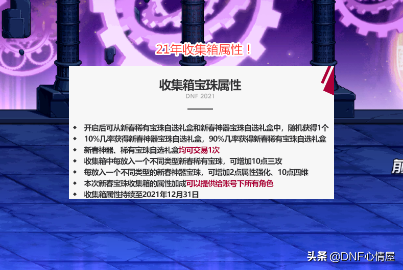 确实没有想到,新春收集箱宝珠,这一次也发生了变化,还以为依然是108点三攻。CH太会玩了,连收集箱宝珠都不放过,加入“随机”套路。之前的金秋礼包,称号礼盒类似收集箱,分为普通和白金级别,同样在概率上为90%和10%。然而,当初拍卖行白金称号礼盒不多,大部分玩家开出的是普通!不知道这一次,神器收集箱宝珠,会不会很难开出来。但说实话,能全账号通用,还是挺香的。