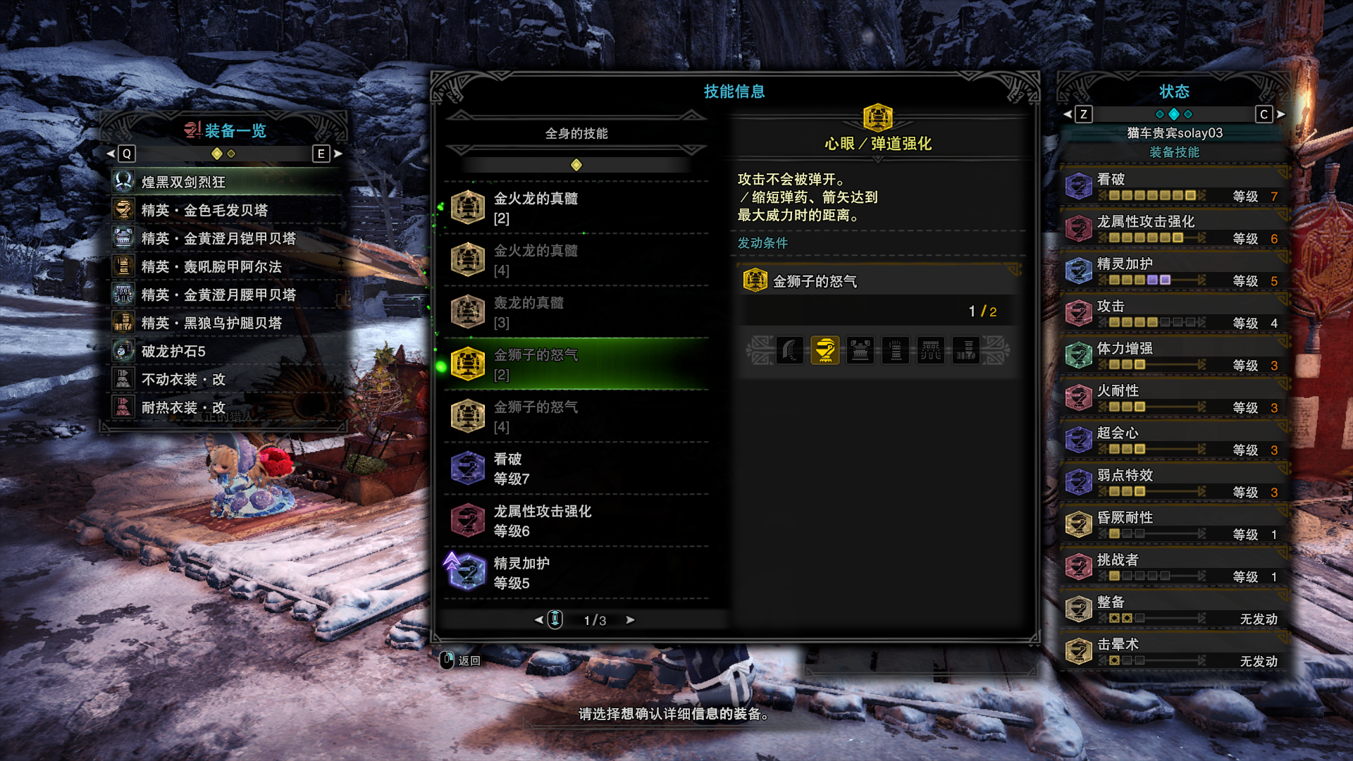 首先面对任何怪物都能提升容错率的【体力3】自然是必备,其次【火属性耐性3】不仅能减免火伤,提高火抗到20点以上还能达到免疫灼烧异常状态的效果,一举两得;【精灵加护5】或者【防御7】也能减免一定量的伤害,后者更为稳定,前者则有可能在某些时候救你一命。个人前期的装备如下: