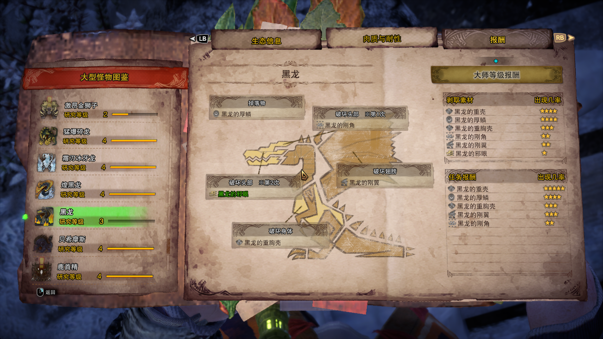 肉质方面,黑龙头部肉质最好,但平时因为位置较高难有打到头的机会,可以通过攻击腹部使其胆怯变为伏地姿态创造机会或者使用斩斧的抱脸虫打法上头,黑龙的吐息招式基本都不会对头部的猎人产生判定,因此抱脸斩斧是面对黑龙最有效的逃课手段。黑龙手和胸部一起计算,共享软化和物理部分肉质(属性吸收不同),软化前斩击,打击和弹击均为可触发弱特的45点肉质。后腿则肉质较差,软化后也无法触发弱特,但相较于头,胸和前爪,站在后腿输出更为安全。属性吸收则以龙属性效果最佳。