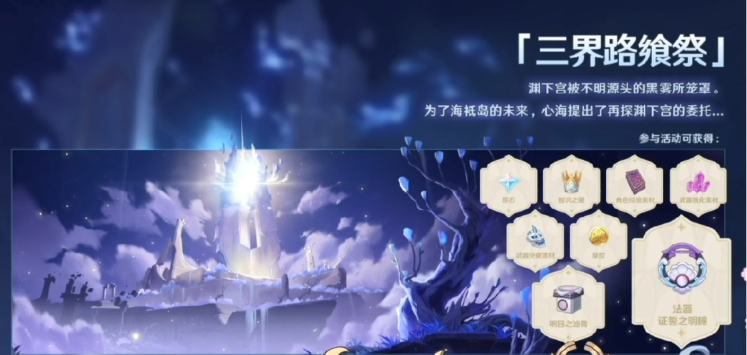 最后给大家汇总下版本活动,活动三界路飨祭,就是暗黑版的渊下宫,和之前的渊下宫探索进度似乎不共享,地图周边被黑雾笼罩,增加了新的探索道具,活动奖励新的四星法器,为心海的外观毕业武器。