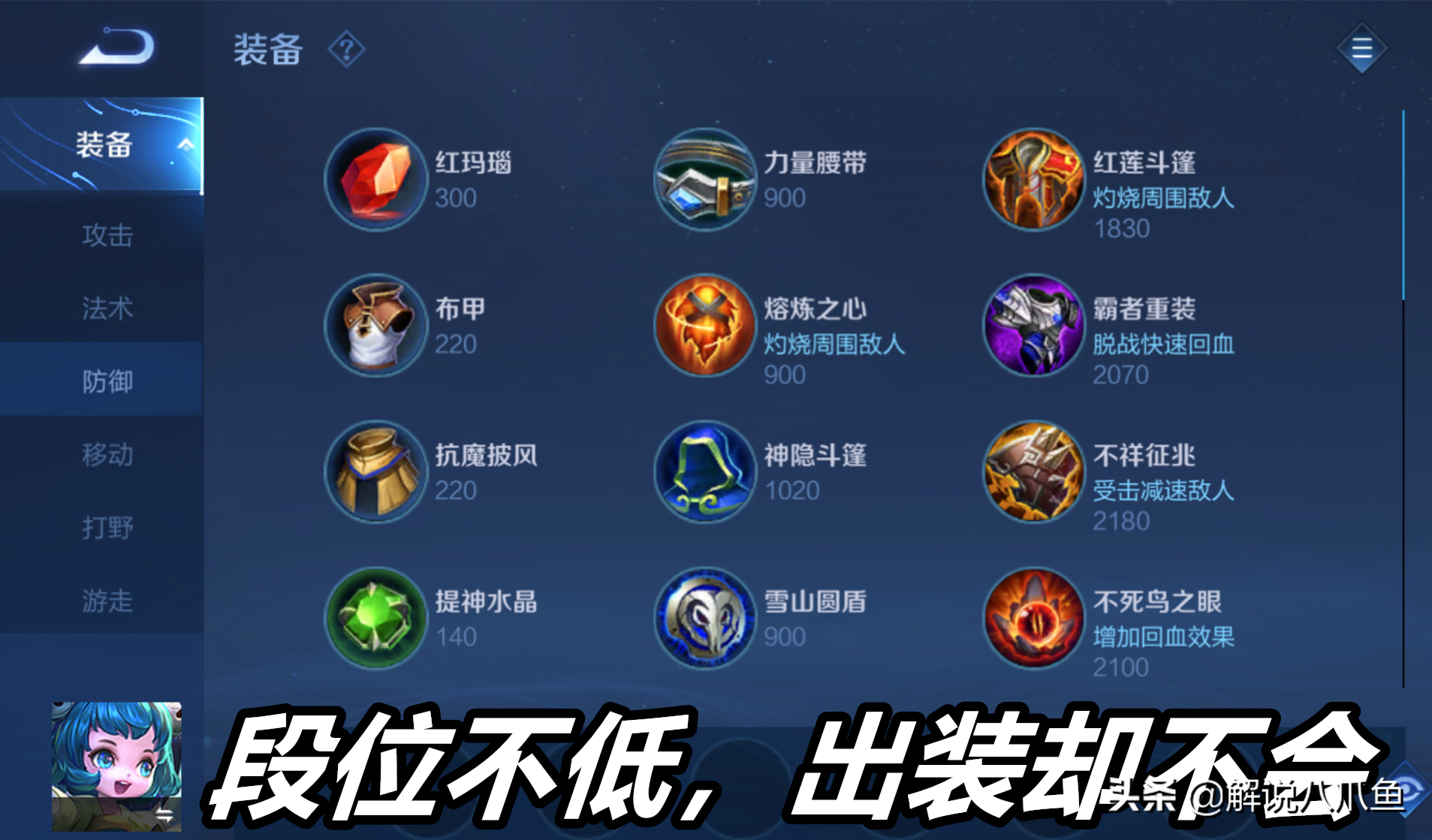 因为现在都有推荐出装,但推荐出装只是推荐,真正的出装是需要你根据实际情况来灵活变动的,但由于有了推荐,大家开始逐渐忽视装备了,造就了现在的哪怕段位是荣耀王者的玩家,装备都不是很懂,经常会犯很多基础的错误。
