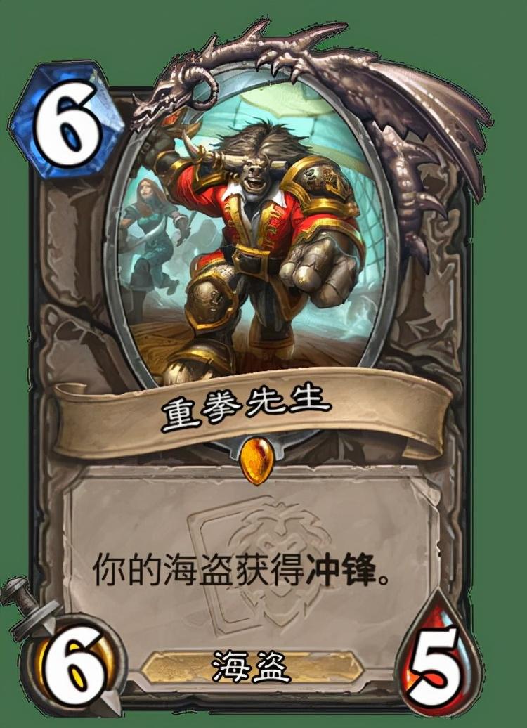 然后我们聊聊比较火热的单卡重拳先生,它完美取代了之前摇摆不定的火车王,本身665冲锋就很超模,除了本身能被无畏战舰招出来之外,它甚至可以被战舰当回合招出来的海盗直接冲锋,其次拉出的空降歹徒也能冲锋,后期甚至有配合血帆袭击者的otk,有了它海盗战后期有了非常高的上线,是对面很难防的。