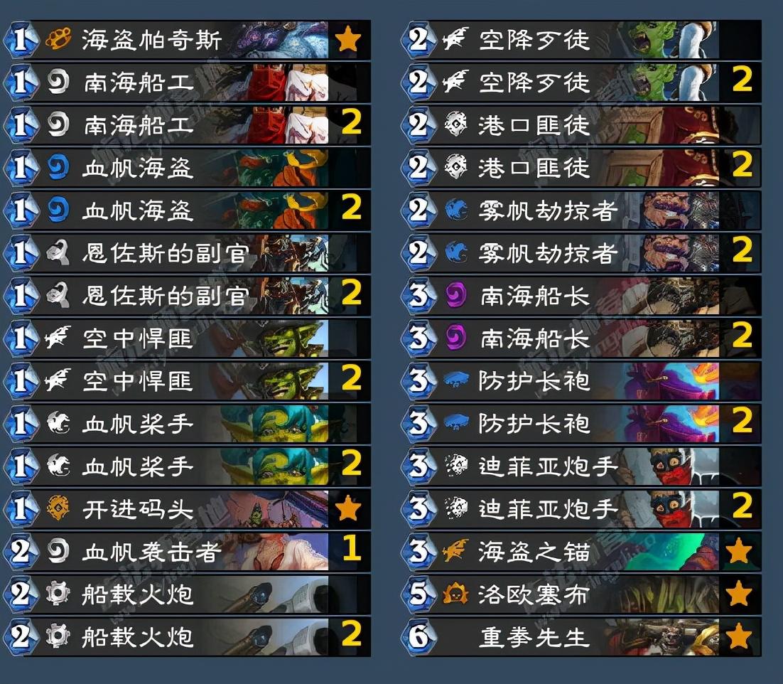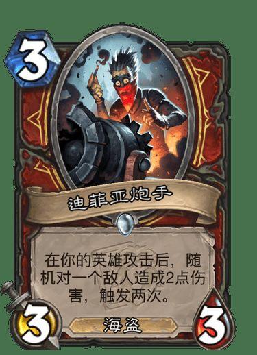 首先我们要了解目前的海盗战是低分段的小boss,在高分段并不厉害,但是新卡来临之后,海盗战的实力确实可以挑战一下高分段,毕竟现在的海盗战是很缺直伤的,现在的海盗战完全就是靠场面打伤害的卡组,但是今天迷你合集之后,可以说变天了,先说迪菲亚炮手我们用它交换了朴实无华的暴风城海盗(都带的话三费曲线过于臃肿)这卡完美取代了英勇打击,首先它是海盗,其次下场至少四点直伤,能打脸能解场,而且海盗战并不缺刀,前期有恩佐斯的副官,中期有海盗之锚,后期有舰长。