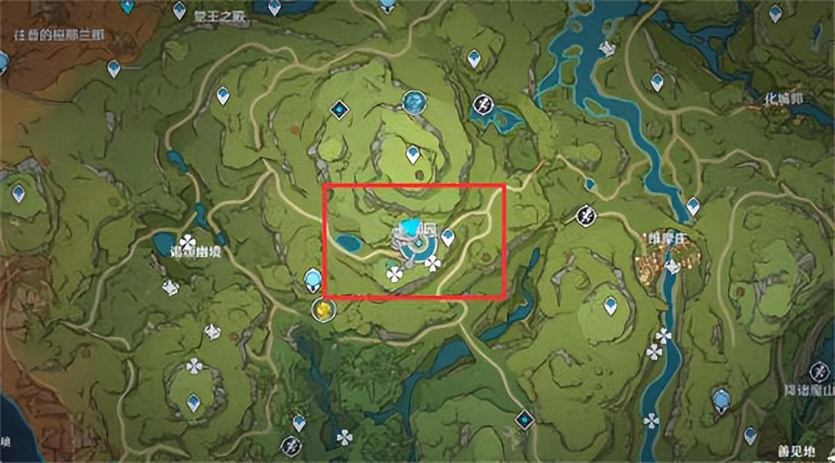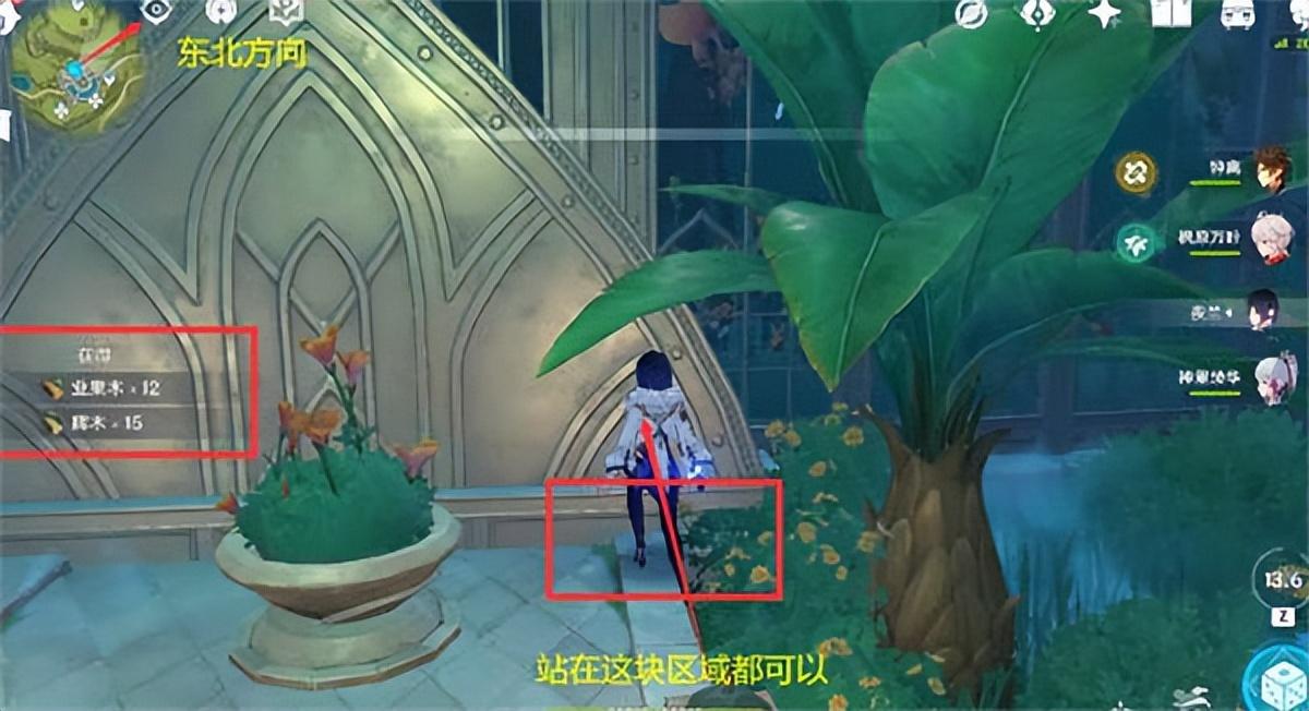 三种木材在须弥的「禅那园」都有分布且分布比较集中,业果木和证悟木在「禅那园」的过道边都有分布,而辉木主要集中在中间的室内植物园里,室内植物园可以看我图示位置。