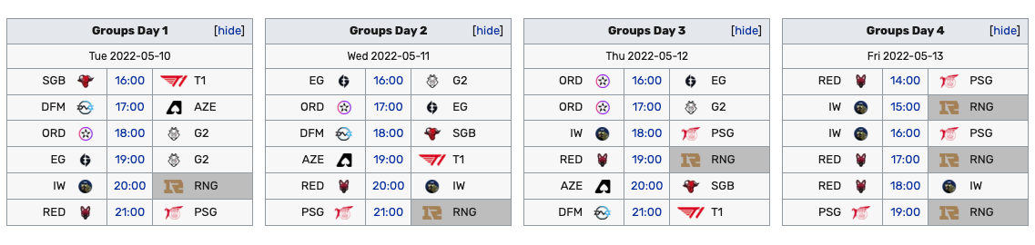 为了方面LPL赛区的观众,我们还将RNG的小组赛赛程摘录了出来,大家记清楚日期和时间即可。