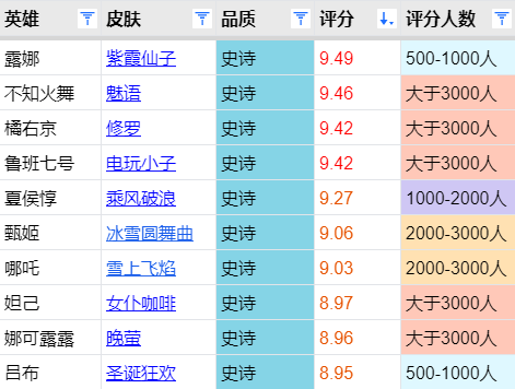 从近代的皮肤优化中可以看到,整体的分数都挺高,在这款皮肤之前,一直是妲己的女仆咖啡在领跑,无限接近9分,孙尚香的水果甜心也不遑多让,可见优化过的皮肤大多都会受到玩家的好评,主要是这些皮肤虽然是史诗,却可以利用碎片在商店兑换,无形中也增加了分数。